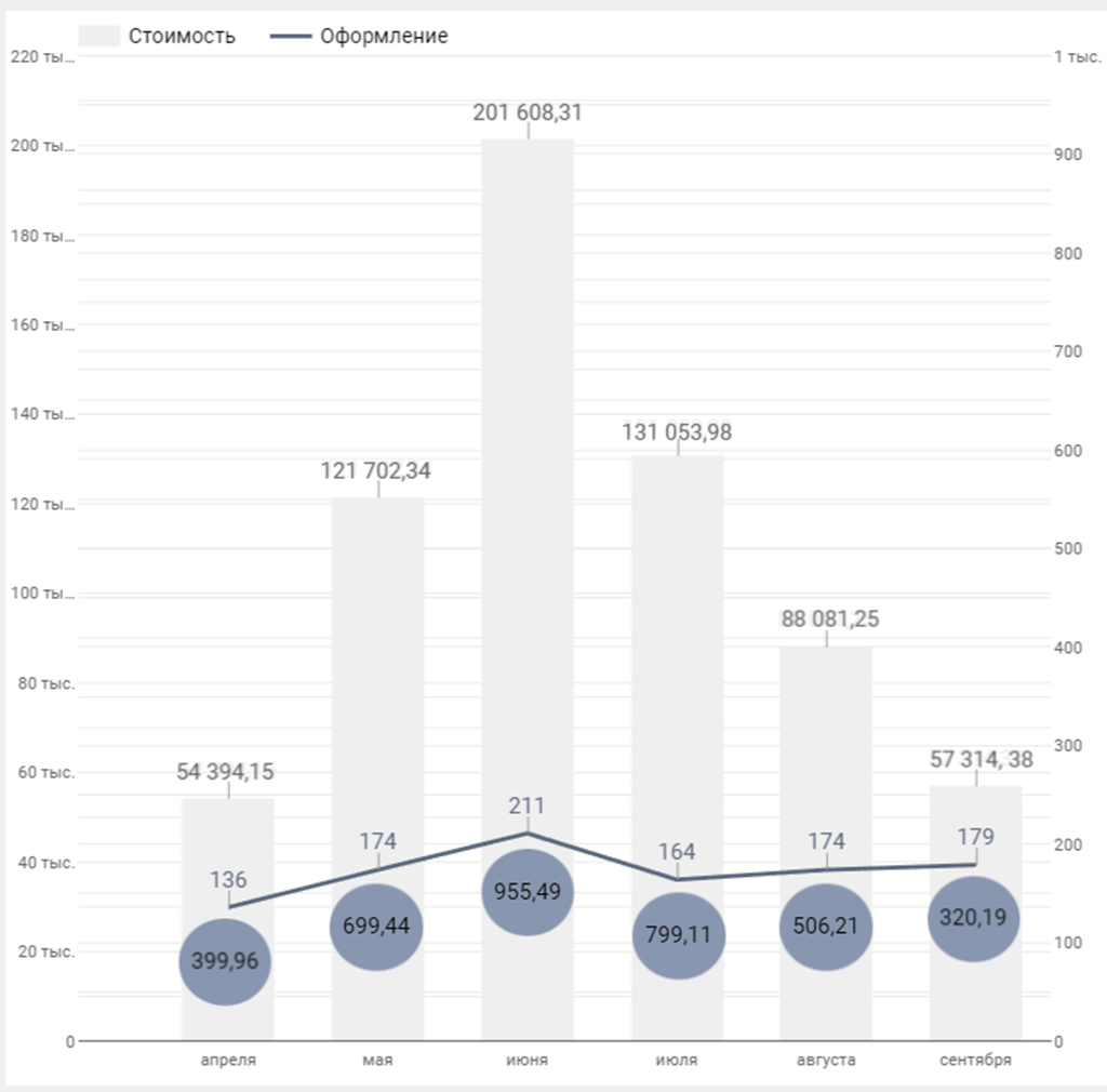 На графике отображено, как менялся расход, сколько конверсий было получено и по какой стоимости. В апреле был минимальный запуск на самые актуальные категории, так сказать «быстрый старт». Затем постепенное масштабирование. Самые большие изменения пришлись на июнь, стоимость конверсии тоже самая высокая, а после – период стабилизации и снижения стоимости конверсии. В июле мы получили более низкую цифру – тут в первой половине месяца уже более-менее обученные кампании и полный набор категорий сайта, а затем изменение стратегии, то есть обучение началось заново. В августе и сентябре – готовые кампании стабильно обучались и становились еще дешевле и приносили все больше конверсий.