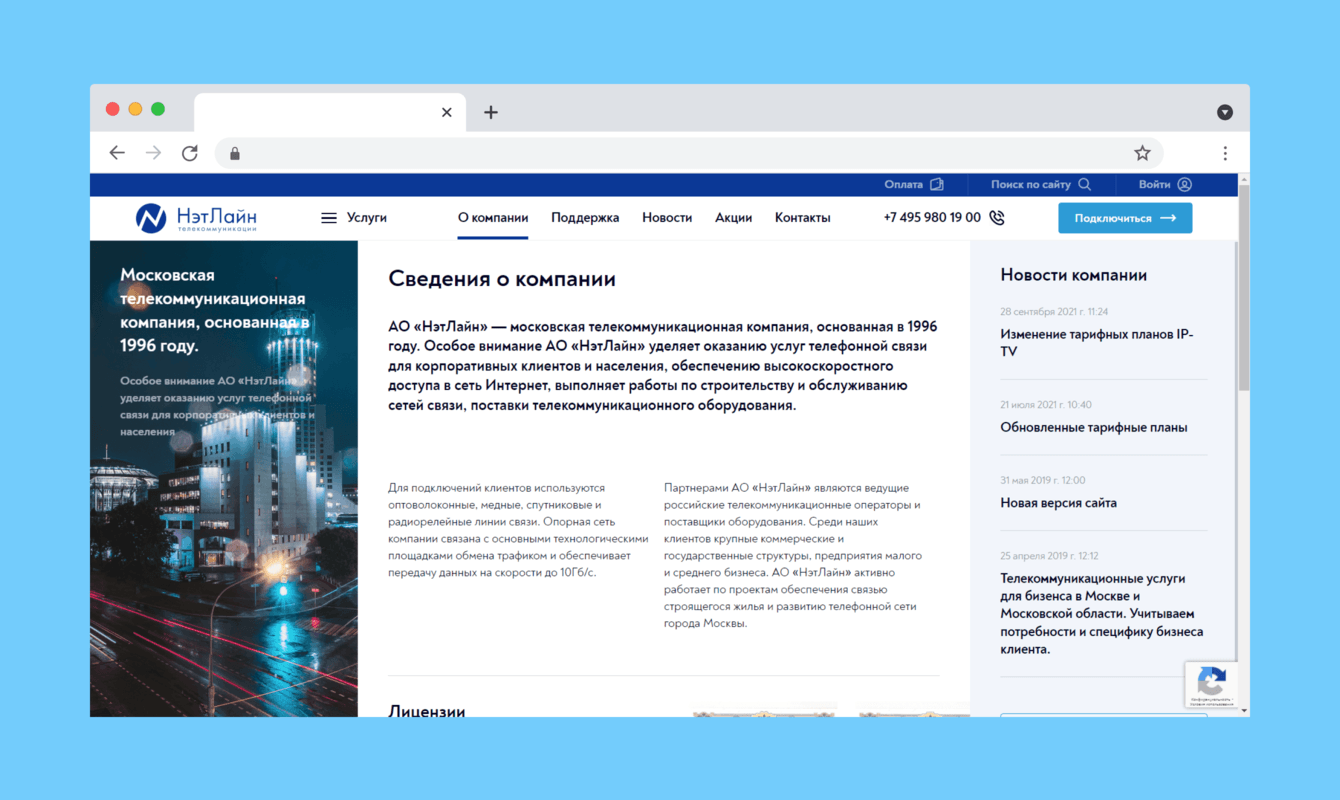 Теперь на сайте простая навигация и легкая структура - несмотря на то, что на сайте много различного контента, пользователь не может в нем потеряться. Все разделы четко разделены. На сайте обозначена подробная информация о компании, указана схема проезда на карте. В отдельном окне открывается форма для заявки на подключение к услугам компании. Заказчик хотел видеть сайт максимально эффектным и удобным. Так и вышло.