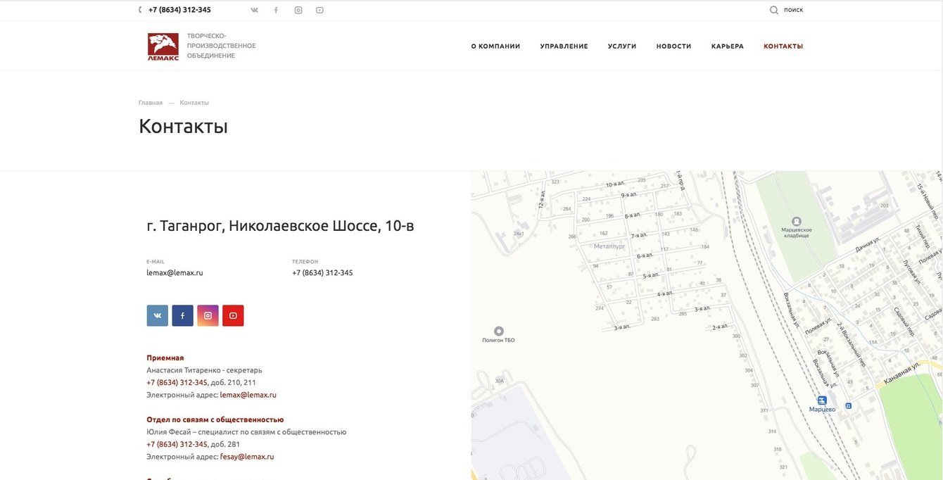 Последний, но не менее важный раздел. Здесь размещены телефоны, электронные адреса компании, социальные сети, форма обратной связи, реквизиты компании и интерактивная карта, которая дает возможность без затруднений найти компанию.