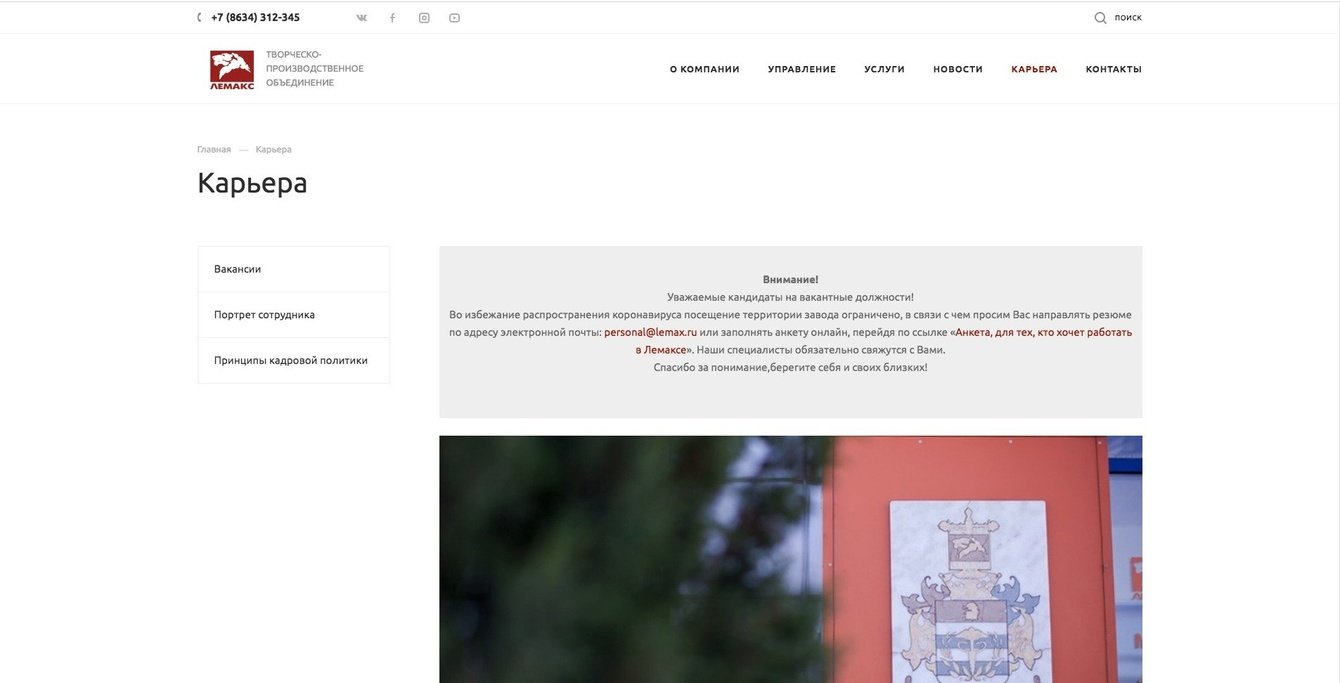 Раздел карьера оказался одним из самых насыщенных по функционалу. Здесь отражены основные аспекты компании по работе с персоналом. От принципов кадровой политики до портрета идеального сотрудника для компании. Но главная фишка в другом. При создании нужно было разработать способ автоматизации найма сотрудников. Была сделана нестандартная интеграция с 1С Зарплата и управление персоналом.