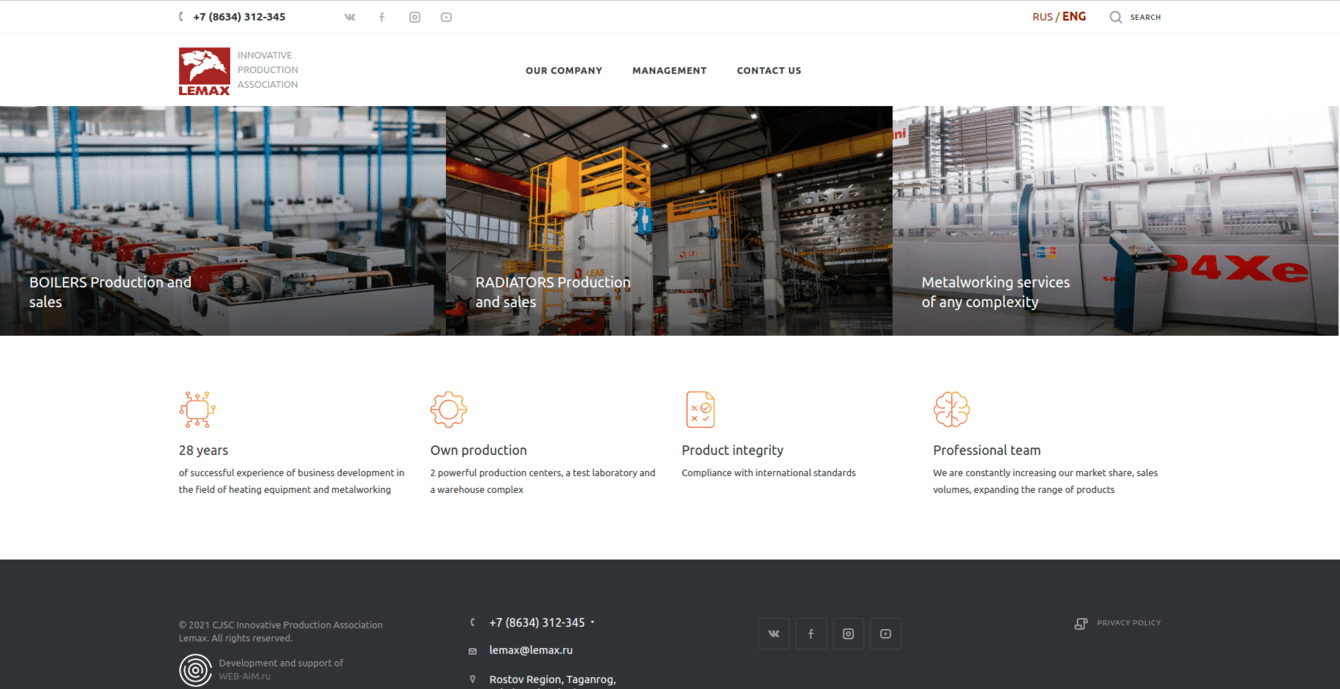 В разделе о компании разместили большой баннер с фотографией завода. Блоки с ссылками на промышленные отрасли производства компании. А также информацию о компании с её миссией, целями и краткой историей,