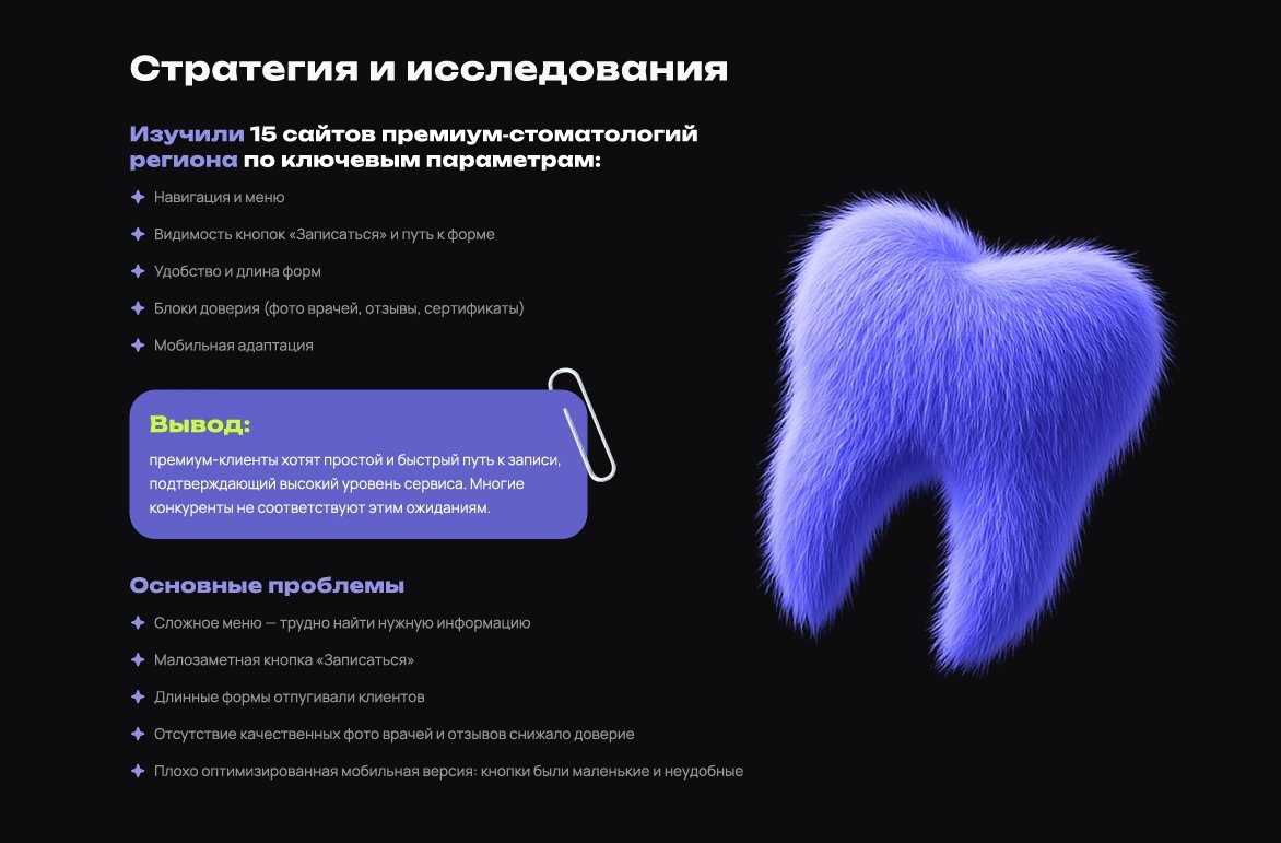Был проведён анализ конкурентов, интервью с администраторами, а также анализ звонков пациентов, чтобы выявить их запросы.