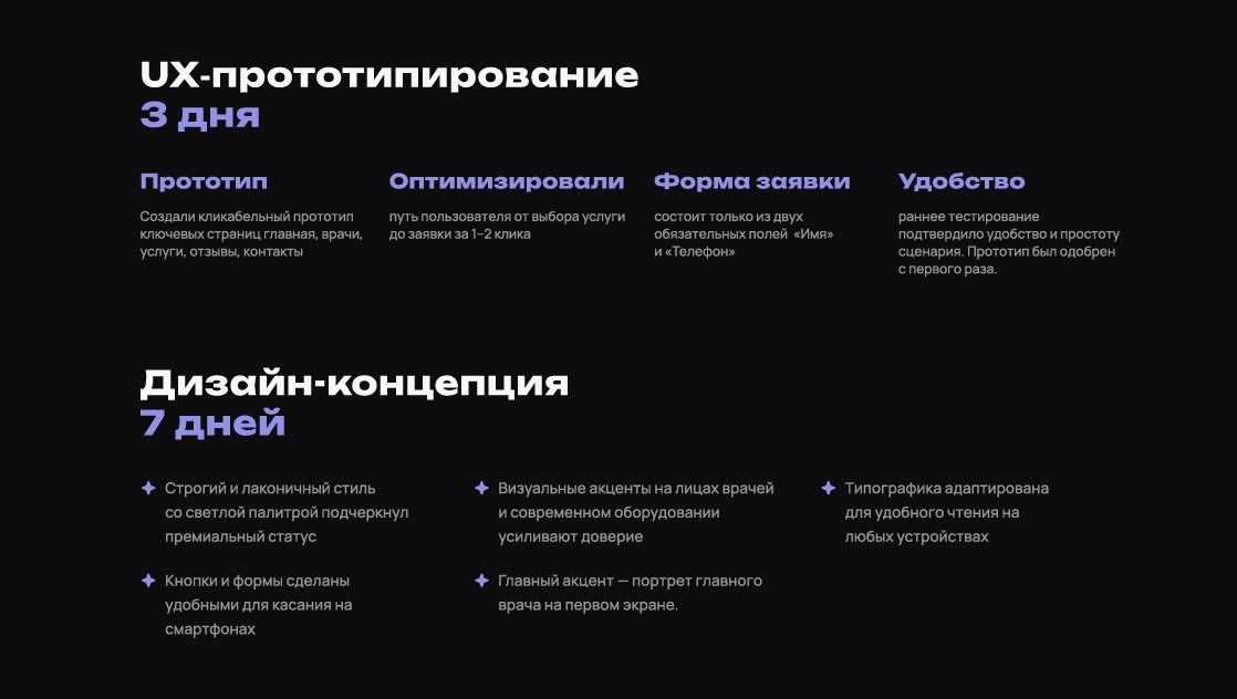 После сдачи проекта клиент передал макеты в разработку и отметил, что визуально сайт стал отражать премиальный уровень клиники.