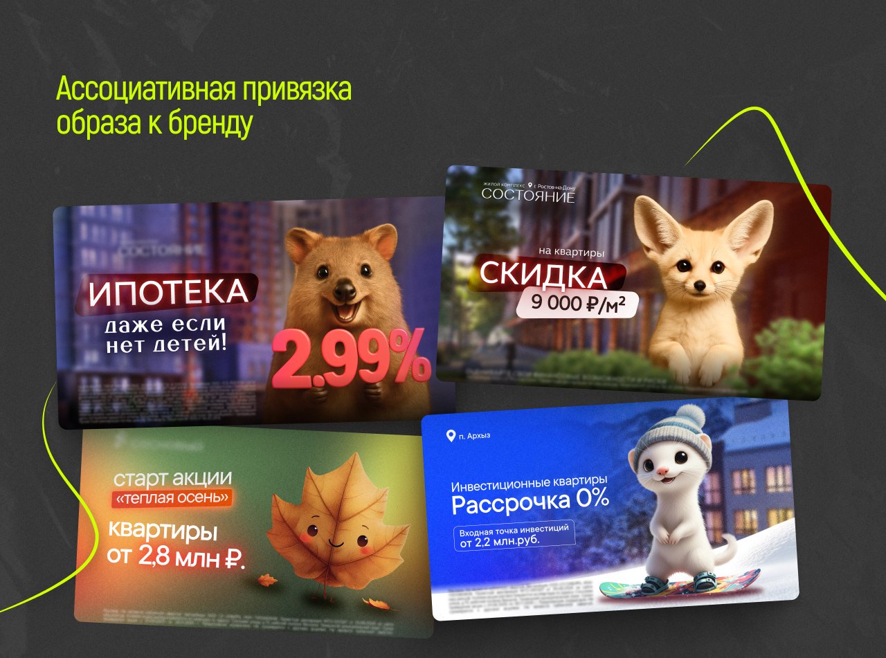 Например, енотов в нашем городе плотно «занял» другой крупный застройщик. И всё — образ автоматически перестаёт быть нашим. Потому что в глазах аудитории он уже ассоциируется с другим проектом. А значит, вместо эмоции мы рискуем получить диссонанс — зритель просто не поймёт, почему «тот самый енот» вдруг продаёт другой дом. Поэтому в каждом проекте я ищу уникального героя — такого, который не просто украшает баннер, а органично вплетается в концепцию и усиливает идею.
