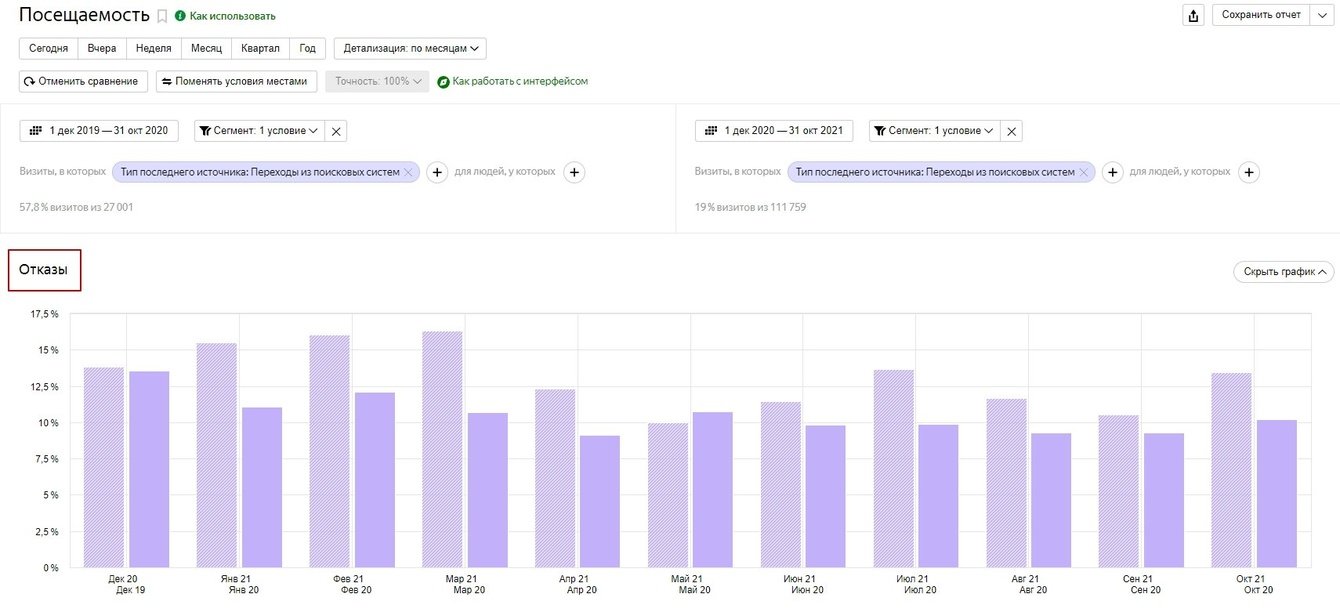 Отказы на сайте снизились в среднем с 12,8 % до 10,2 %