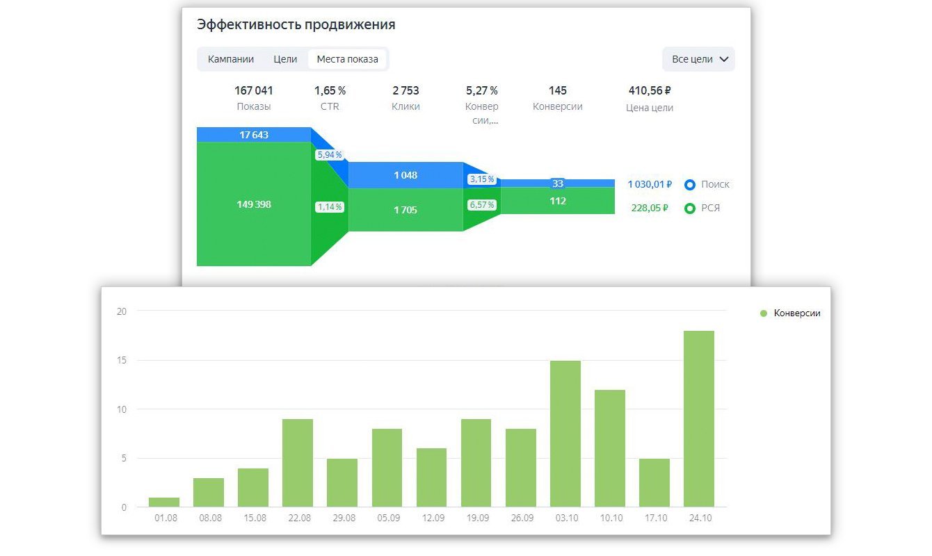 Оптимальный выбор для начала Директа в таком случае – текстово-графические объявления на поиск и РСЯ (размещение через рекламную сеть Яндекса на сайтах-партнёрах). Также на данном этапе: