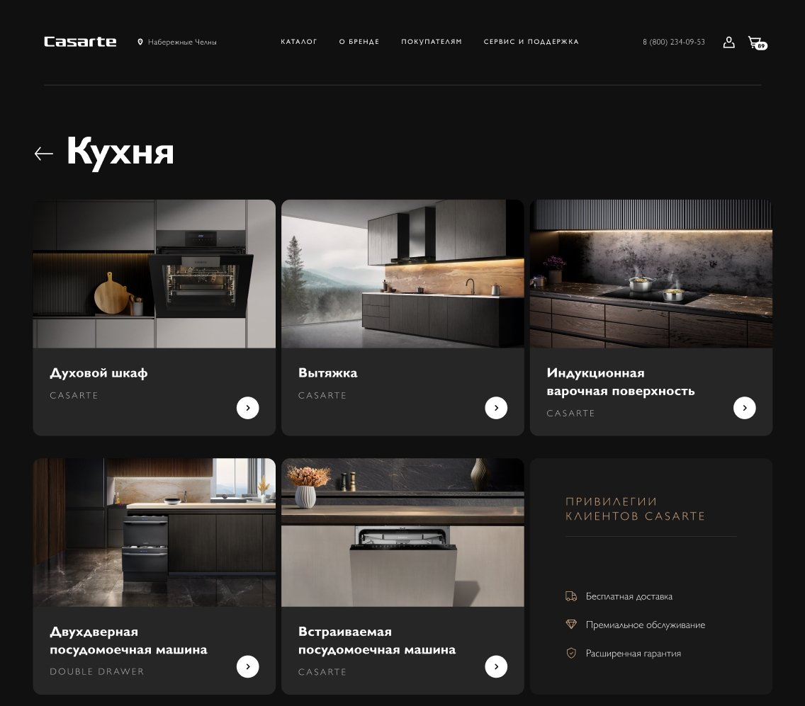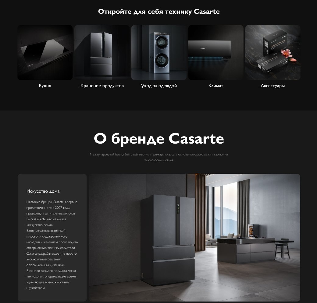 Сайт Casarte стал ключевым инструментом для продвижения премиальной техники бренда, подчеркнув её эксклюзивность и высокотехнологичность