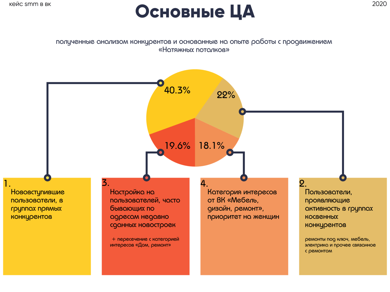 Исходя из нашего опыта в сфере строительства и ремонта, а так же основываясь на аналитике конкурентов мы собрали и посчитали 4 основные группы ЦА. Заглядывая вперед, могу сказать что мы угадали со всеми группами и отклик на рекламу в процентах примерно соответствовал нашим подсчетам.