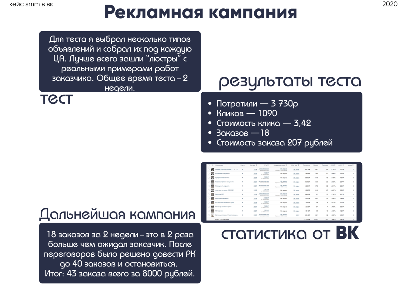 Изначально предполагалась большая компания с бюджетом в несколько десятков тысяч рублей, но мы недооценили спрос. С началом пандемии многие остались дома и запланировали ремонт, наши объявления как раз ударили по этой аудитории и получили огромный отклик. За первые же 2 недели мы получили заказов на месяцы вперед, по стоимости в полтора раза ниже чем ожидали. Еще через неделю заказчик нанял 4 помощников и попросил увеличить количество заказов. Проведя работу над ошибками и мы переделали объявление и получили 25 заказов за следующие 2 недели.
