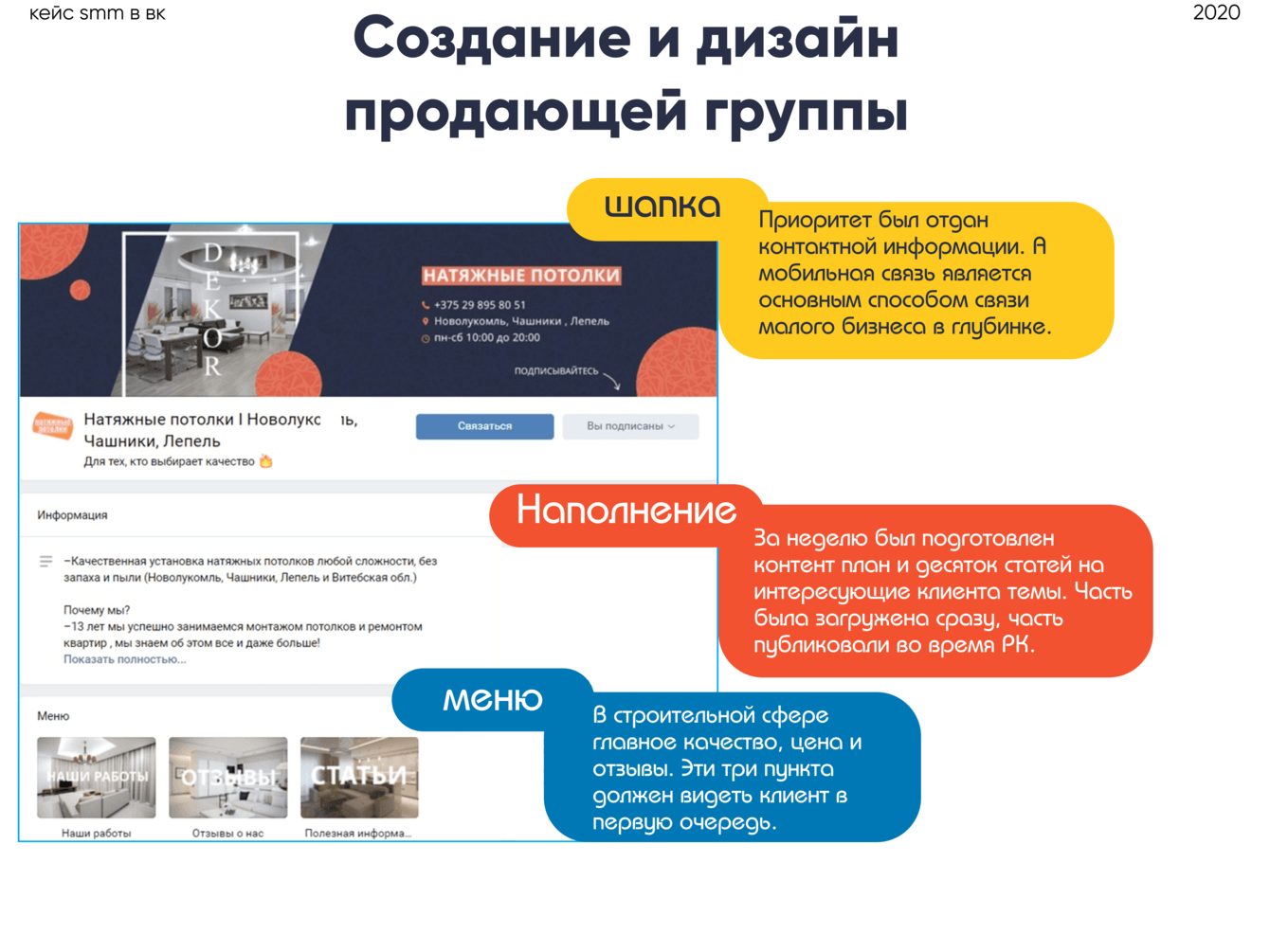 По опыту работы над такими проектами мы сразу начали с группы в вк. Ее дизайн должен быть на порядок выше чем у конкурентов, а наполнение привлекать потенциальных клиентов.