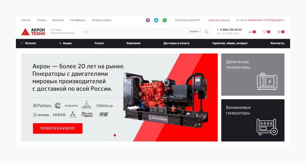Промышленно-металлургический холдинг «Акрон» решил создать новое направление «Акрон Техно» по продаже генераторов и автономных электростанций. Необходимо было с нуля запустить полнофункциональный интернет-магазин за 30 дней, имея только: