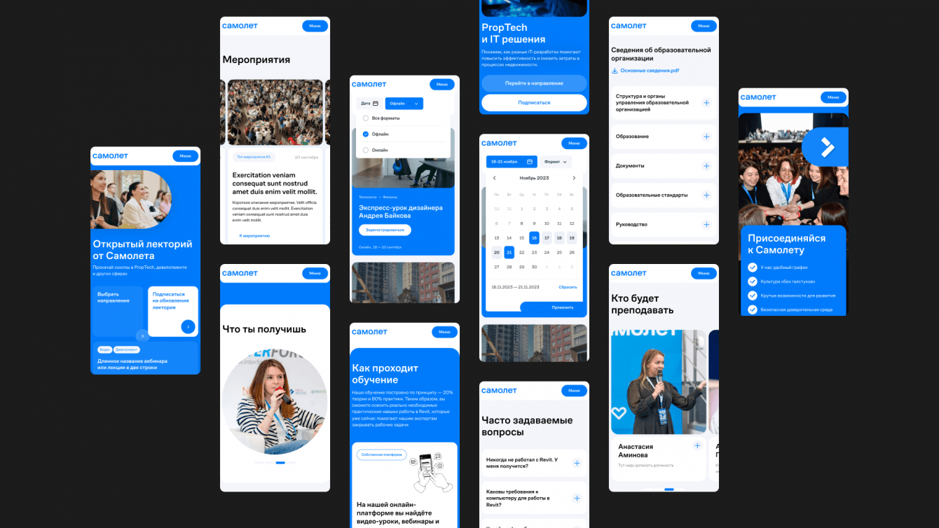Мы немного вышли за рамки текущей дизайн системы бренда и добавить что-то новое. Поэтому развили историю с различными формами шейпов, которые присутствуют в брендбуке, сделали их функциональными элементами и построили на этом стиль всего лектория. Подкрепили сайт анимациями, чтобы больше погрузить пользователя и дать ему понятный онбординг в продукт.