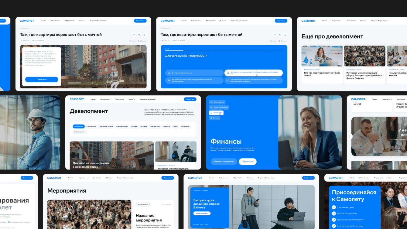 Мы немного вышли за рамки текущей дизайн системы бренда и добавить что-то новое. Поэтому развили историю с различными формами шейпов, которые присутствуют в брендбуке, сделали их функциональными элементами и построили на этом стиль всего лектория. Подкрепили сайт анимациями, чтобы больше погрузить пользователя и дать ему понятный онбординг в продукт.