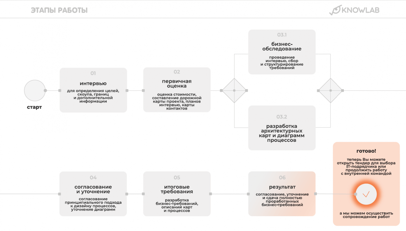 Результаты этапа стали базисом для дальнейшего движения и проработки бизнес-требований, а также проектирования бизнес-процессов на основе изначальных параметров.