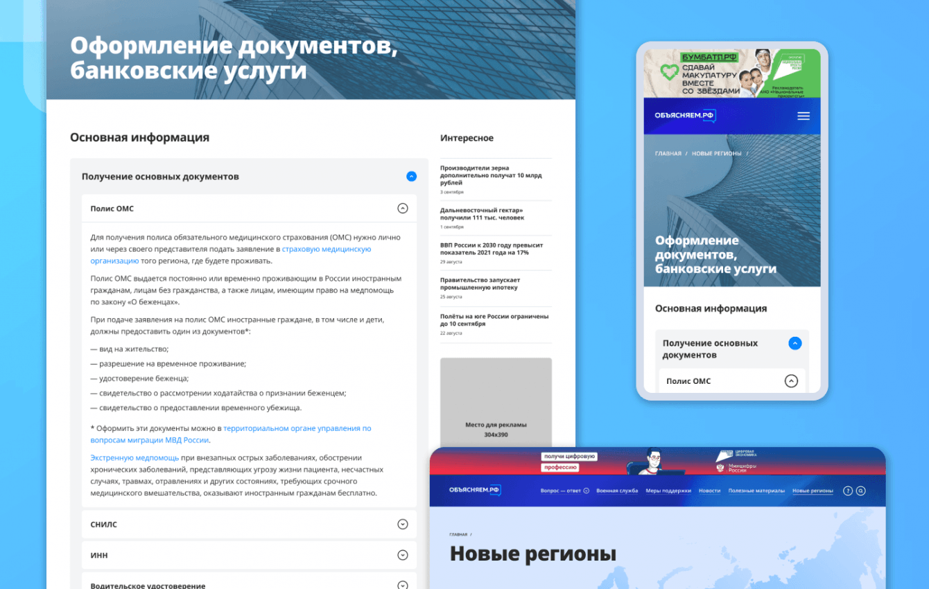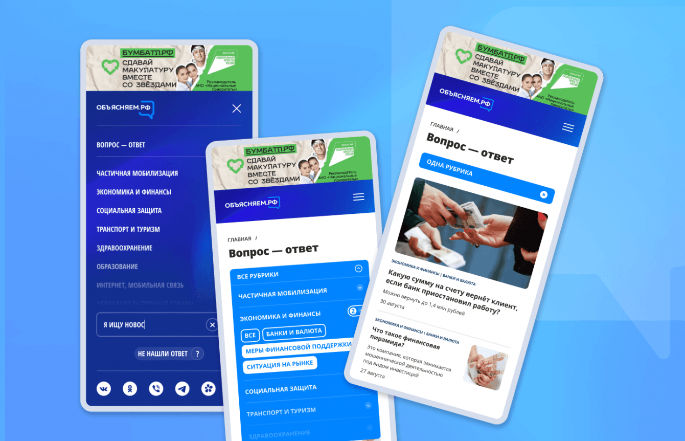 Объясняем.рф — агрегатор важной информации о ситуации в России. Здесь собраны ответы на сотни вопросов от соцпомощи до туризма, финансов и здравоохранения. Поэтому основной фокус направлен на проектирование комфортной информационной архитектуры. В основе лежит принцип mobile first, поскольку более 70% пользователей заходят на сайт с мобильных устройств.