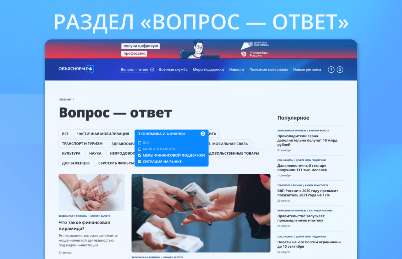 Если найти информацию вручную не удалось, пользователь может задать вопрос чат-боту «Помощник Объясняем.рф». Самые популярные ответы собраны в разделе «Вопрос-ответ», где настроена расширенная фильтрация по принципу чекбокса.