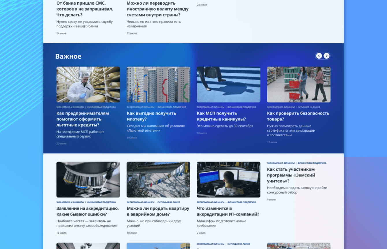 Ресурс содержит разноформатные материалы: новости, советы, гайды. Важно было учесть это разнообразие, сделать поиск интуитивным и максимально быстрым. Для того чтобы читатель без труда ориентировался в потоке контента и находил ответы, мы переработали пользовательский путь, сделали простую и понятную для широкой аудитории навигацию с фильтрацией, сайдбарами и блоками, а также оптимизировали структуру сайта. Так, для разделов «Военная служба» и «Новые регионы» выбрана блочная модель — на главной странице посетитель видит карточки, которые ведут на страницы в формате FAQ. Такой подход обеспечивает последовательный user flow.