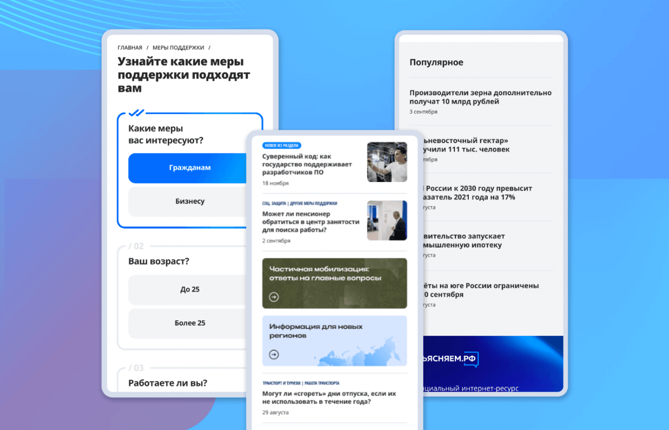 Объясняем.рф — агрегатор важной информации о ситуации в России. Здесь собраны ответы на сотни вопросов от соцпомощи до туризма, финансов и здравоохранения. Поэтому основной фокус направлен на проектирование комфортной информационной архитектуры. В основе лежит принцип mobile first, поскольку более 70% пользователей заходят на сайт с мобильных устройств.