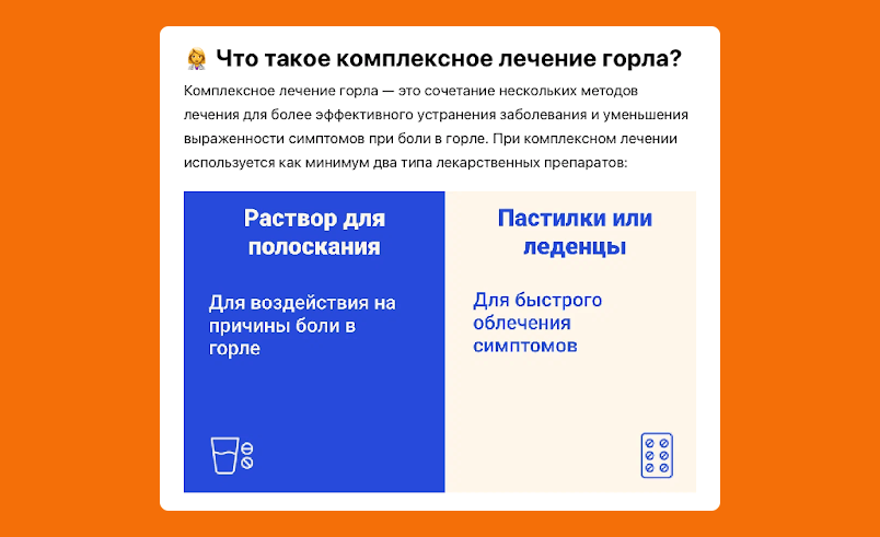 В четвертой статье мы раскрыли критерии, которые помогут выбрать правильное лекарство от боли в горле — из самых разных аэрозолей, спреев, таблеток, леденцов и пастилок. Статья набрала 46% дочитываний, CTR — 2,3%.