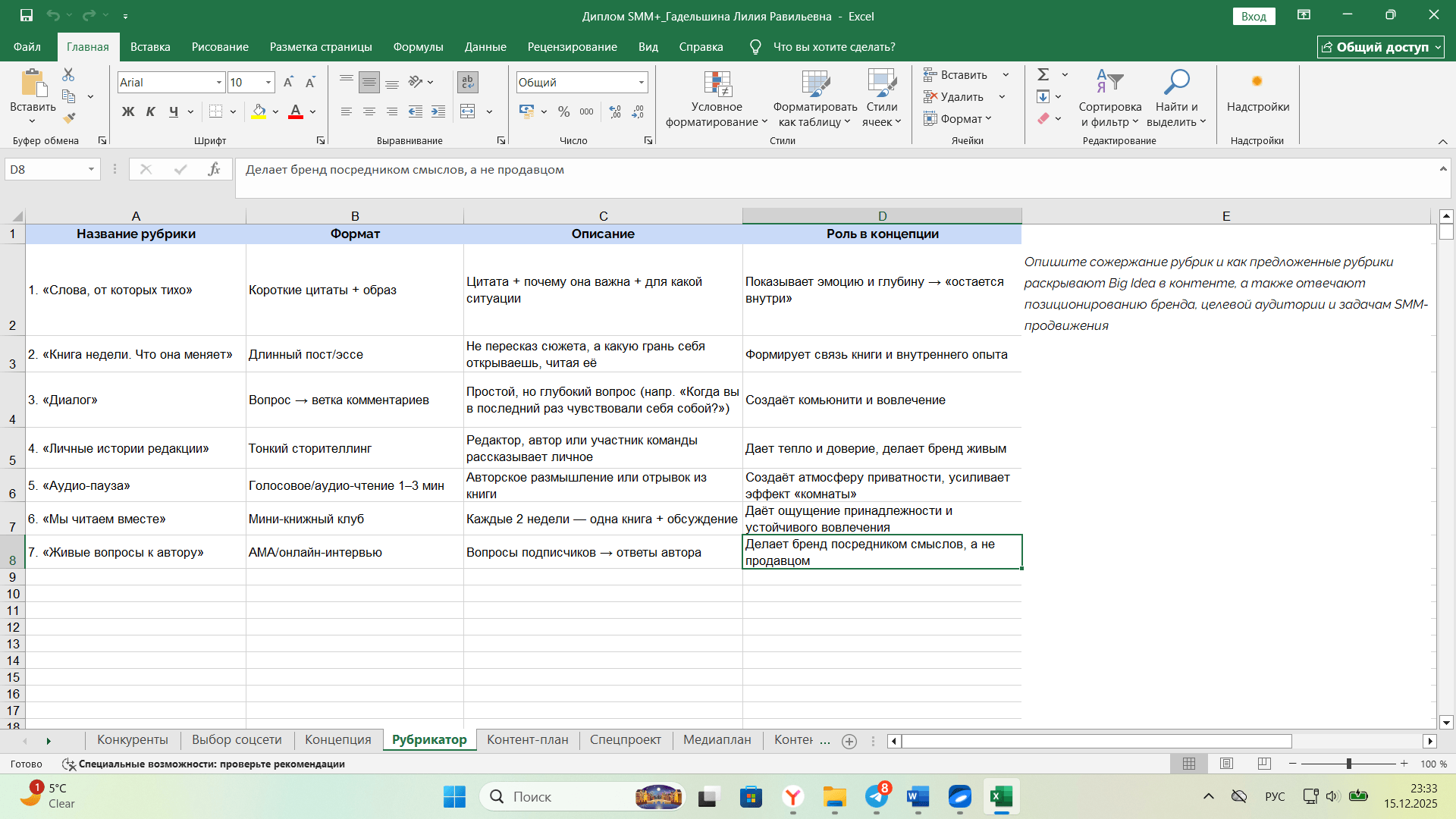формирование семи рубрик, раскрывающих идею и цели SMM;