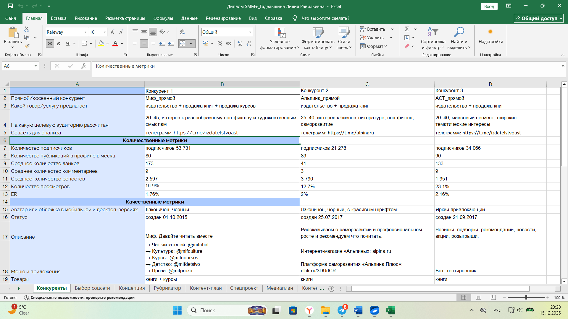 Анализ конкурентов (3+) — изучить контент, визуал, частоту публикаций, вовлечённость и ошибки, чтобы выделить точки дифференциации бренда.
