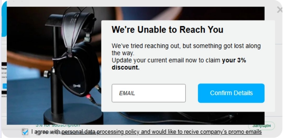 Создали и запустили шесть всплывающих окон (pop-up): тестировали разные гипотезы, проверяли механики. На пике активности у нас работало сразу пять разных форм. В итоге три отключили, а остальные собирают контакты до сих пор. Также оставили стандартные формы сбора данных. Такой формат мотивирует клиента совершить первую покупку. После регистрации ему приходит письмо со скидкой 3% на первый заказ.