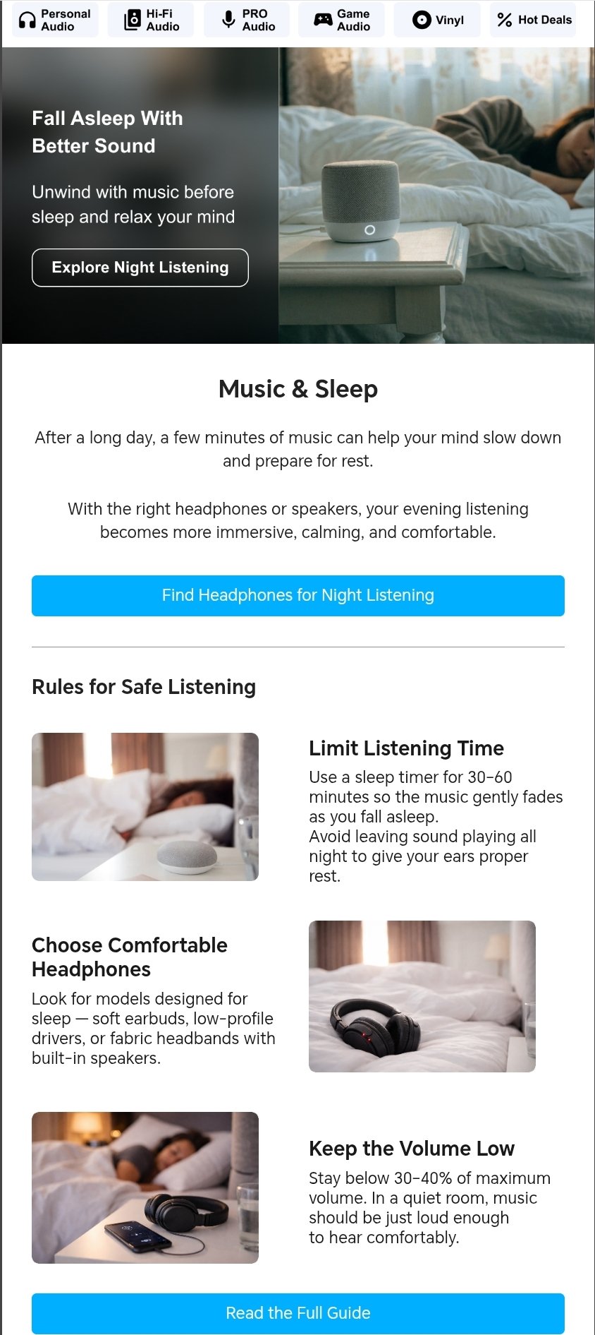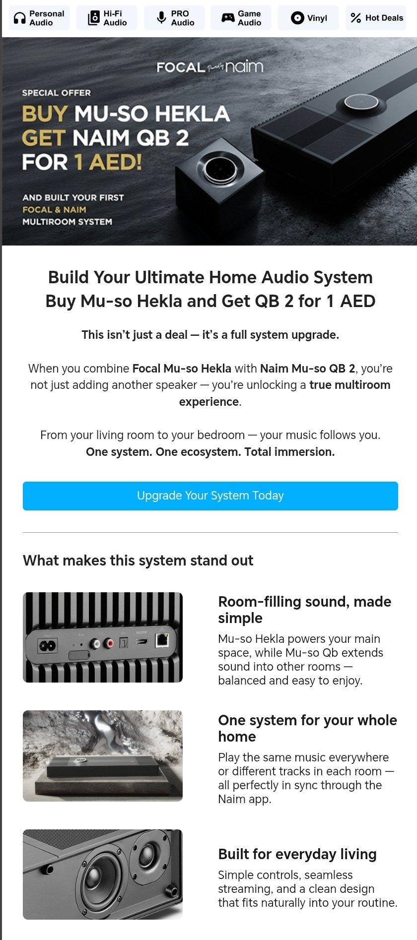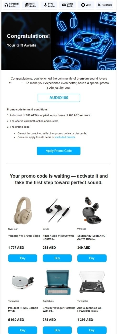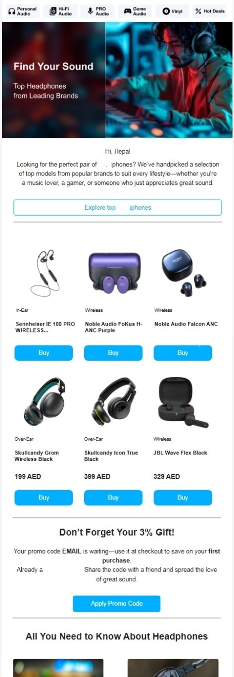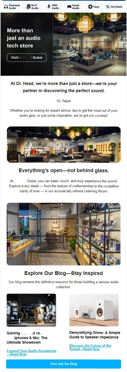 На первом этапе запуска CRM-маркетинга (канала рассылок) бренду важно было рассказать посетителям и клиентам интернет-магазина, что открылась офлайн-точка в Дубае. В салоне можно вживую увидеть товары известных брендов и послушать их звучание. Главная цель — раскрутка магазина и набор базы.