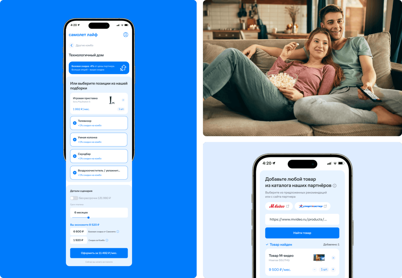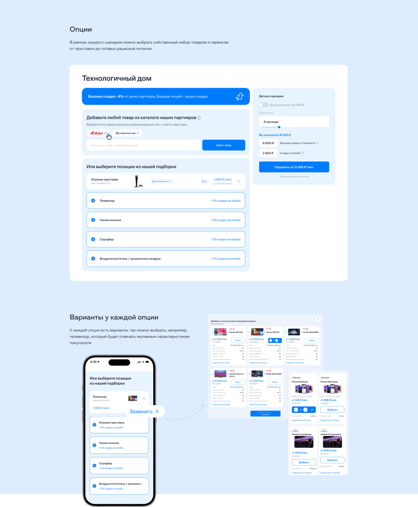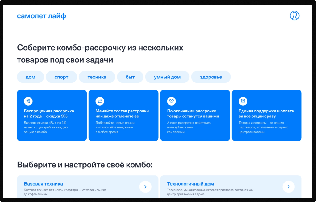 Для компании «Самолет» нужно было реализовать проект комбо-решений для комфортной жизни. Компания «Самолет» разработала сценарии покупки товаров в удобном для покупателей формате. Можно выбрать необходимый набор товаров — от бытовой техники до сервисов клининга и настроить детали платежа.