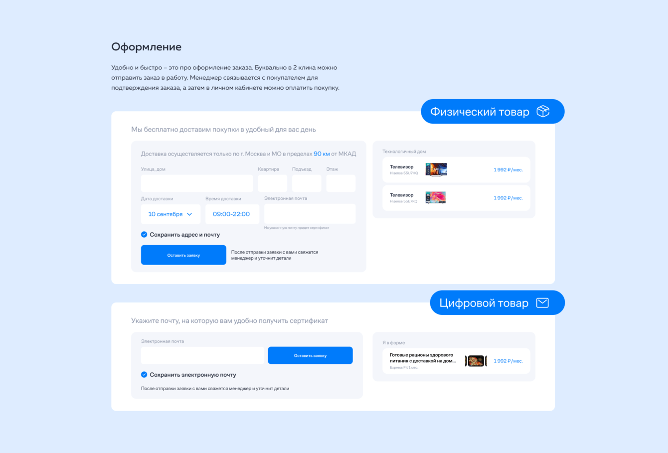Мы решили не перегружать покупателя лишними экранами, поэтому сразу на главной можно прочитать про сервис и выбрать товары.