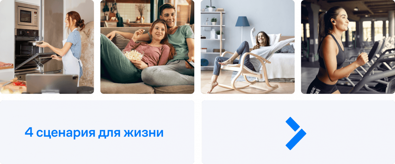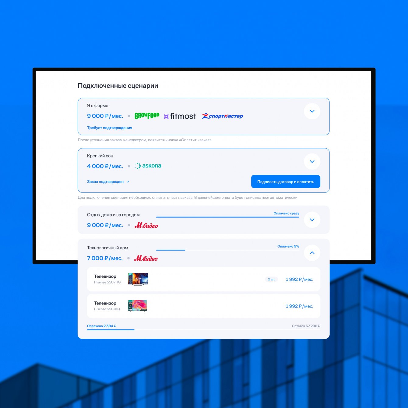 Сервис предлагает 4 сценария для основных сфер жизни. В каждом из них можно выбрать необходимые товары или абонементы. Платежи настраиваются покупателем в зависимости от его пожеланий и возможностей.