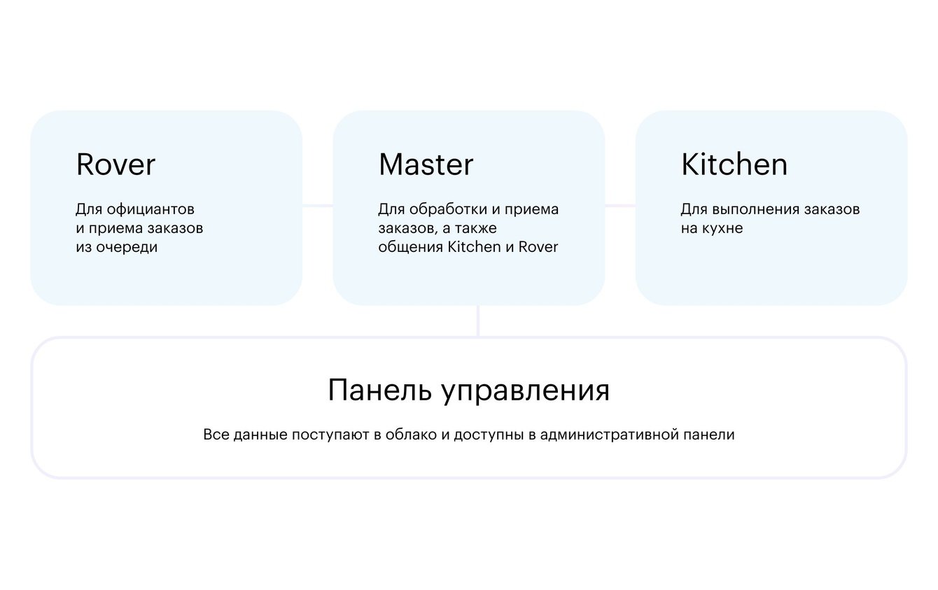 Наша POS-система — это три взаимосвязанных приложения и административная панель управления.