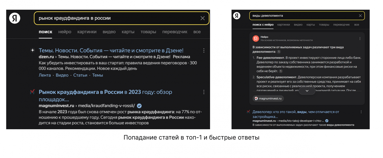 Некоторые статьи по ключевым запросам попадают в топ-1 и быстрые ответы.