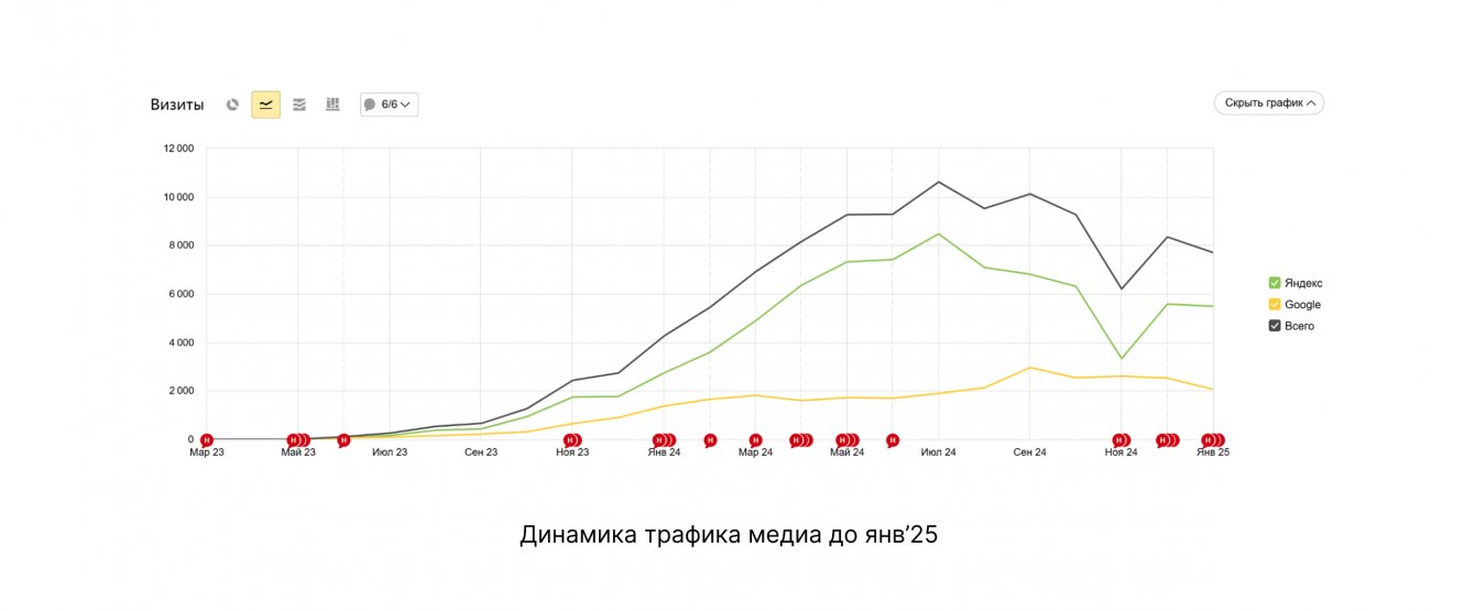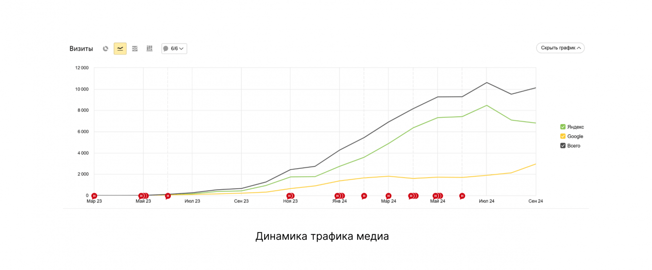 Основной канал дистрибуции — органика. Поэтому под каждую статью для медиа мы готовили SEO-ТЗ. Другие каналы для охвата — ВК, телеграм, Яндекс.Дзен, VC.ru.