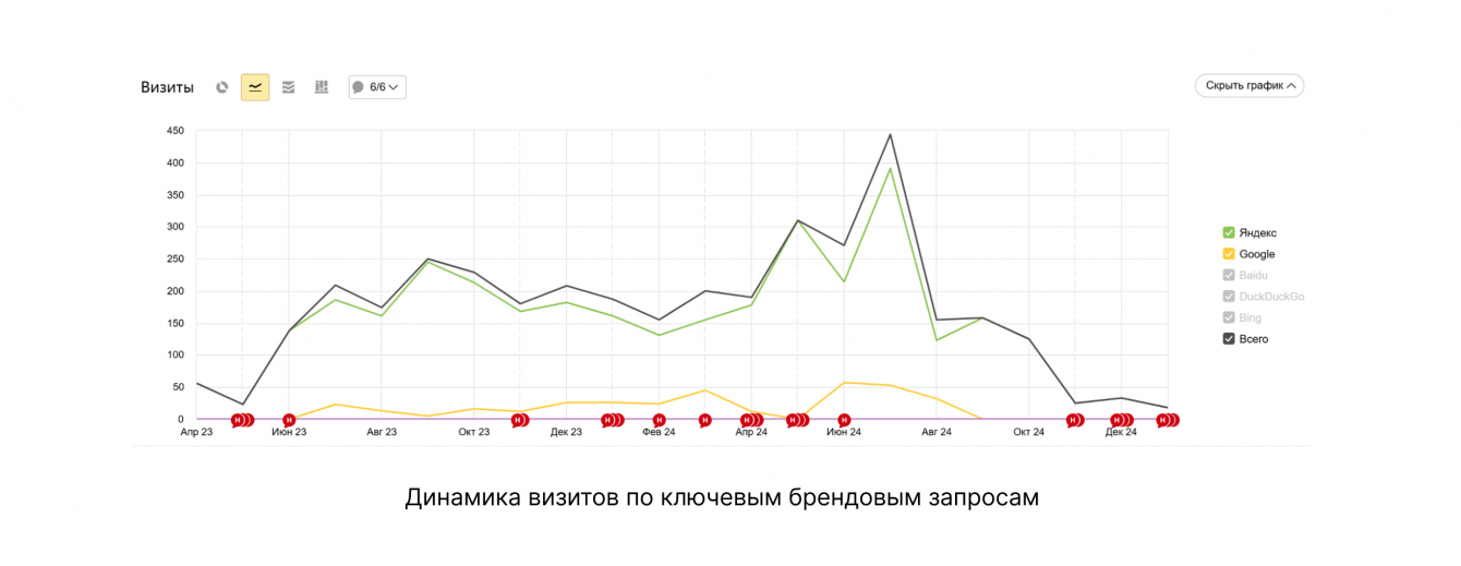 Благодаря комплексной работе, в том числе PR-публикациям, брендовый органический трафик увеличился, пользователи стали чаще искать компанию в поисковых системах.