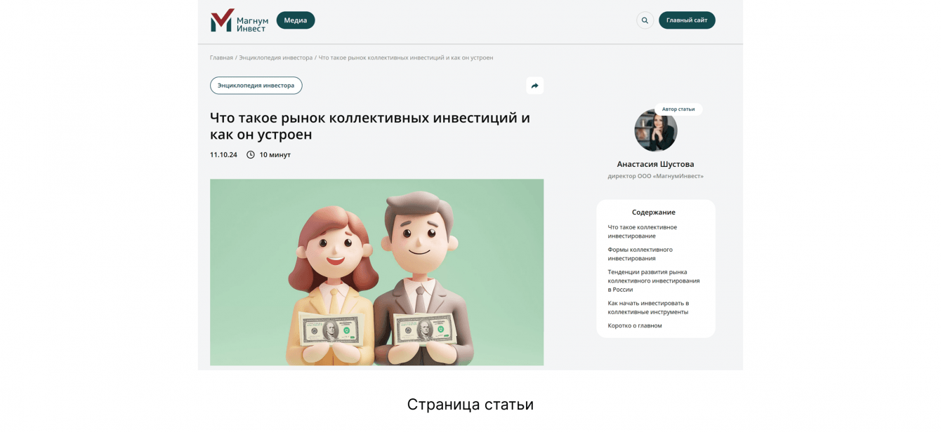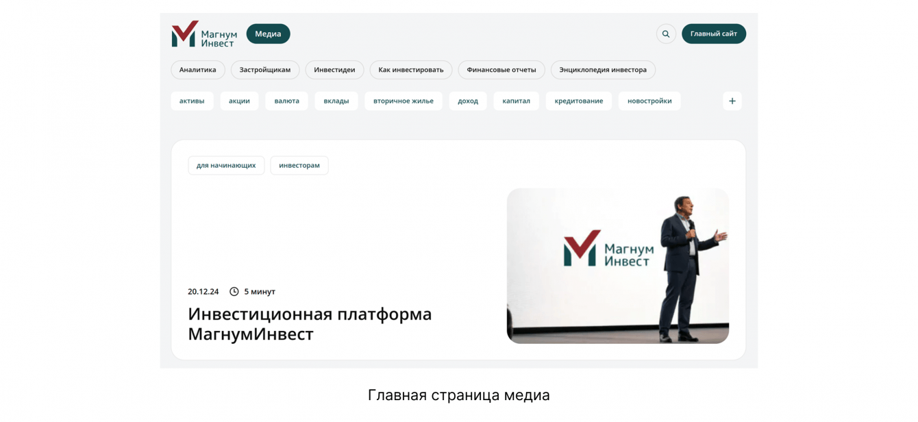 В марте 2023 года команда МагнумИнвест обратилась к нам с задачей создать бренд-медиа. На тот момент у клиента были сайт на Тильде, телеграм-канал и сообщество ВКонтакте, которые развивали всего месяц. Платформа только начинала работать, поэтому цель была — привлечь целевую аудиторию с помощью экспертного контента и повысить узнаваемость.