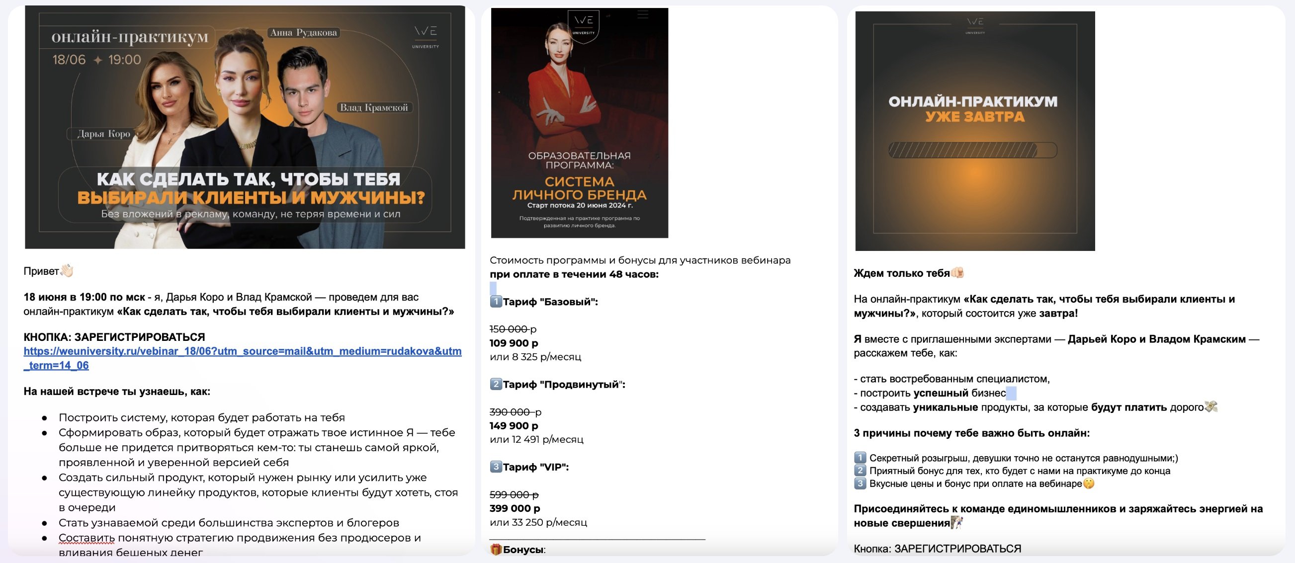 - Разработали структуру посадочных страниц для регистрации на бесплатные вебинары (на теплый трафик) с конверсией в регистрацию 11% и ценой регистрации 79 рублей;