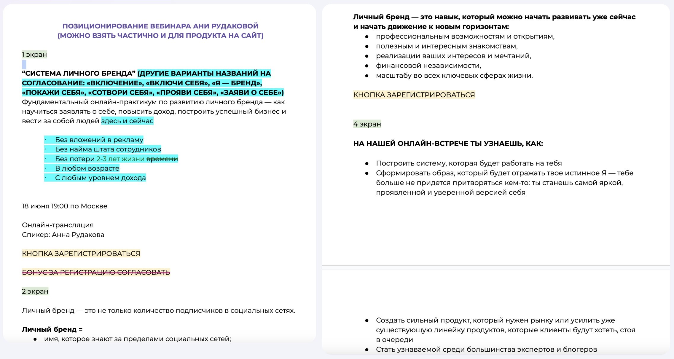 – Разработку текстов для посадочных страниц продающих мероприятий и лендинга продукта, который запускали – “Система личного бренда”