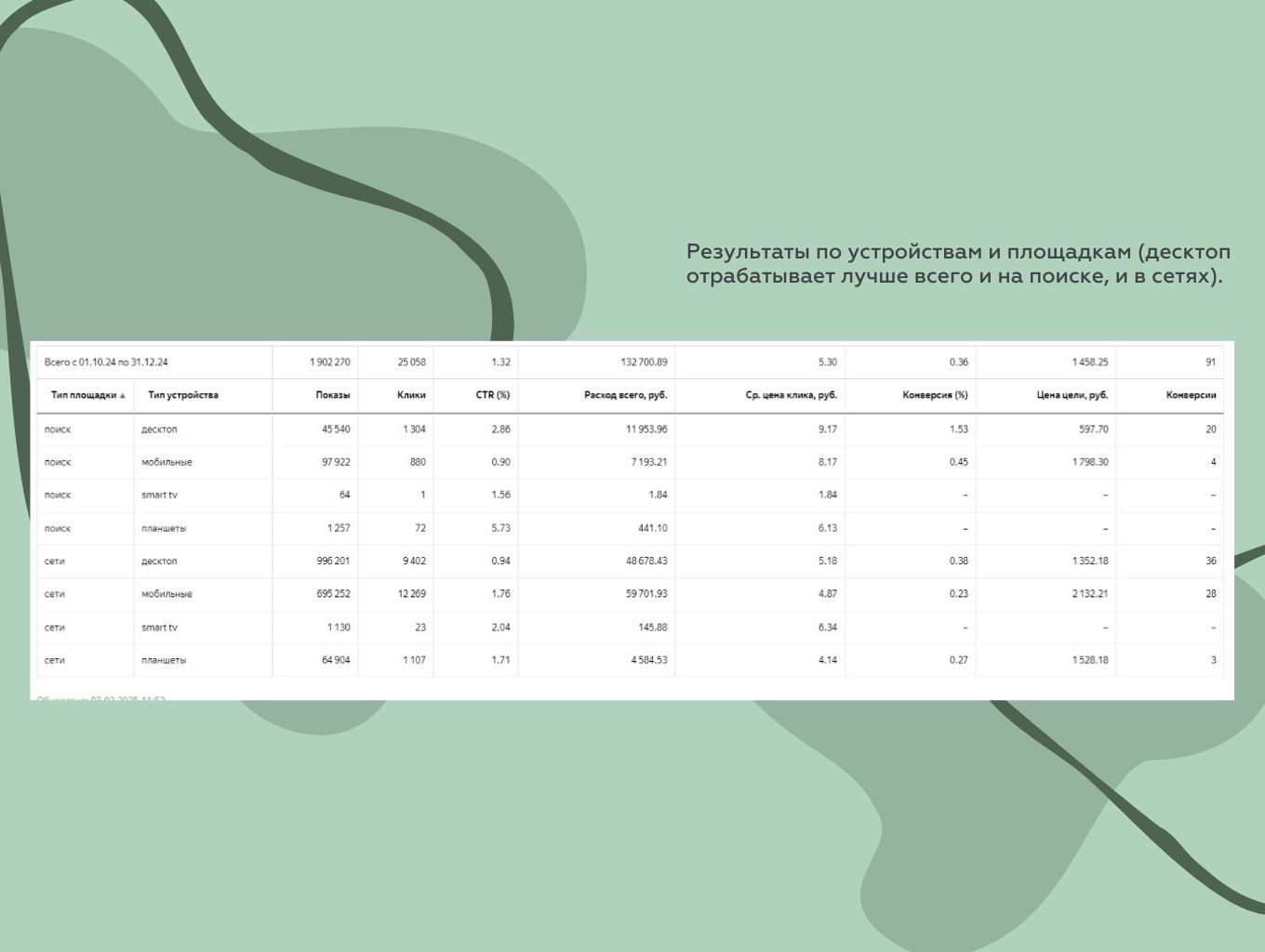 — Проанализировали, что аудитория с ПК показывает лучшую конверсию, и установили повышающую корректировку ставок для этого сегмента.