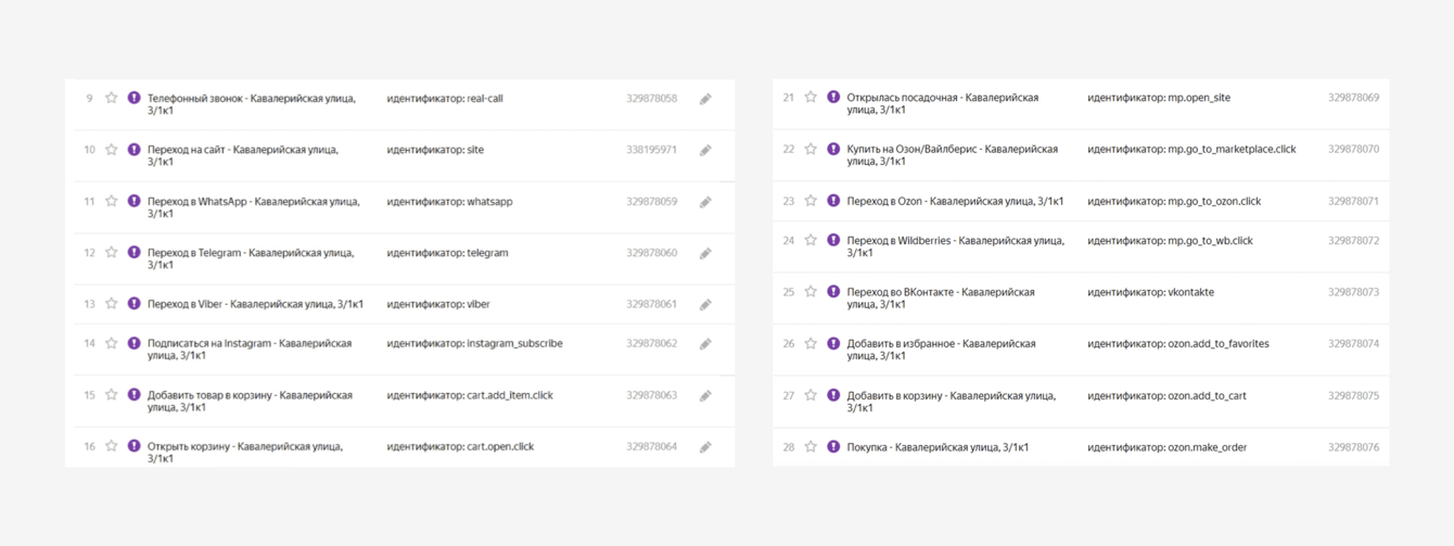 Настройка микро- и макро целей для оптимизации работы рекламных кампаний. В данном проекте использовались как макроцели, так и микроцели. За основу были взяты макроцели: целевые звонки, переходы в Telegram (Телеграм) и WhatsApp. Также для оптимизации работы рекламных кампаний были также настроены микроцели: построение маршрута, просмотр страниц каталога.