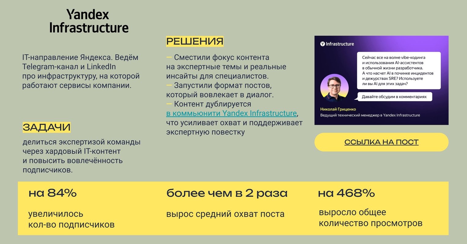 Контент дублировался в коммьюнити Yandex Infrastructure, что помогало влиять на охват.