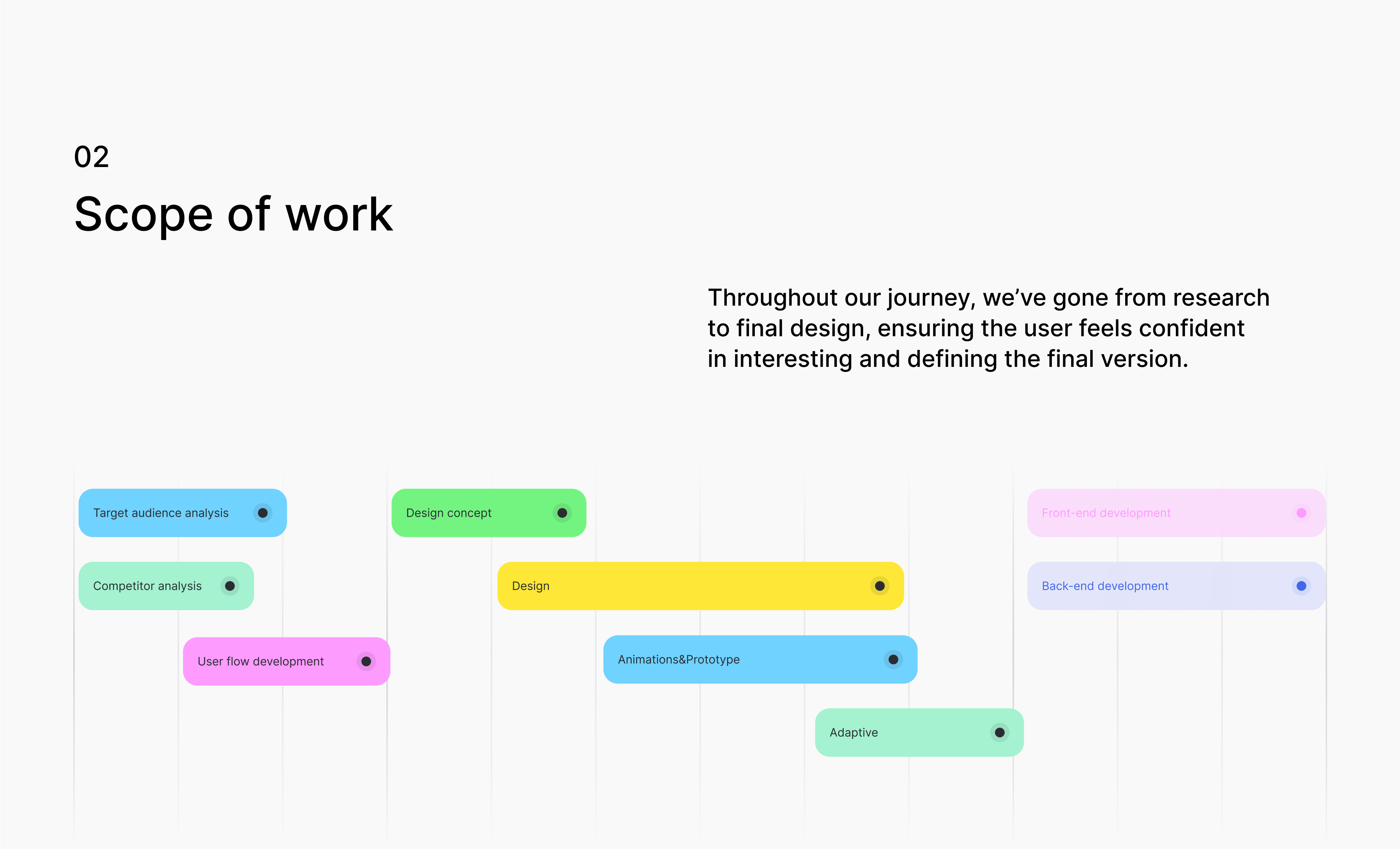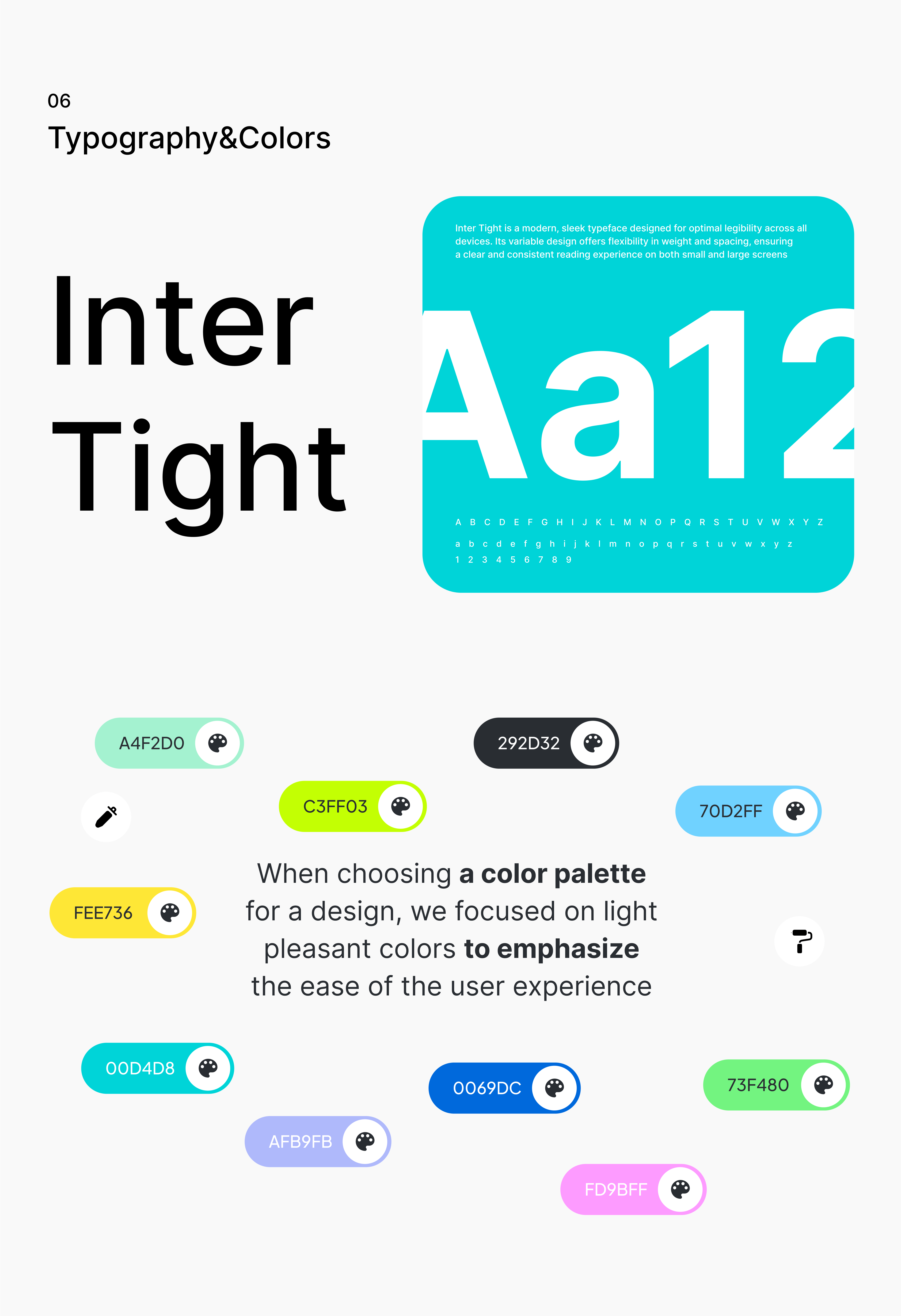 Минимализм с акцентами. Заказчик хотел чёрно-белый сайт. Но мы предложили концепт с палитрой из 10 оттенков, вдохновлённой тем, как программисты и дизайнеры подсвечивают важное в своих тетрадях и редакторах: мягкие, но яркие цвета на фоне спокойного белого и чёрного.