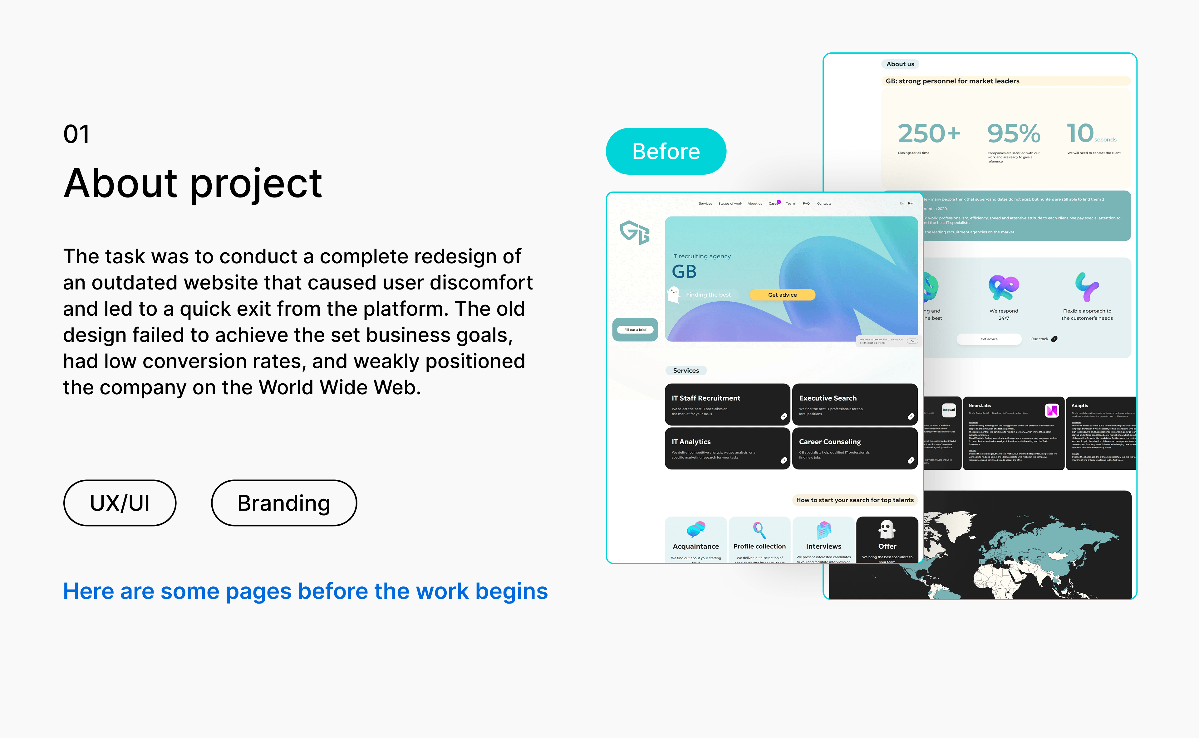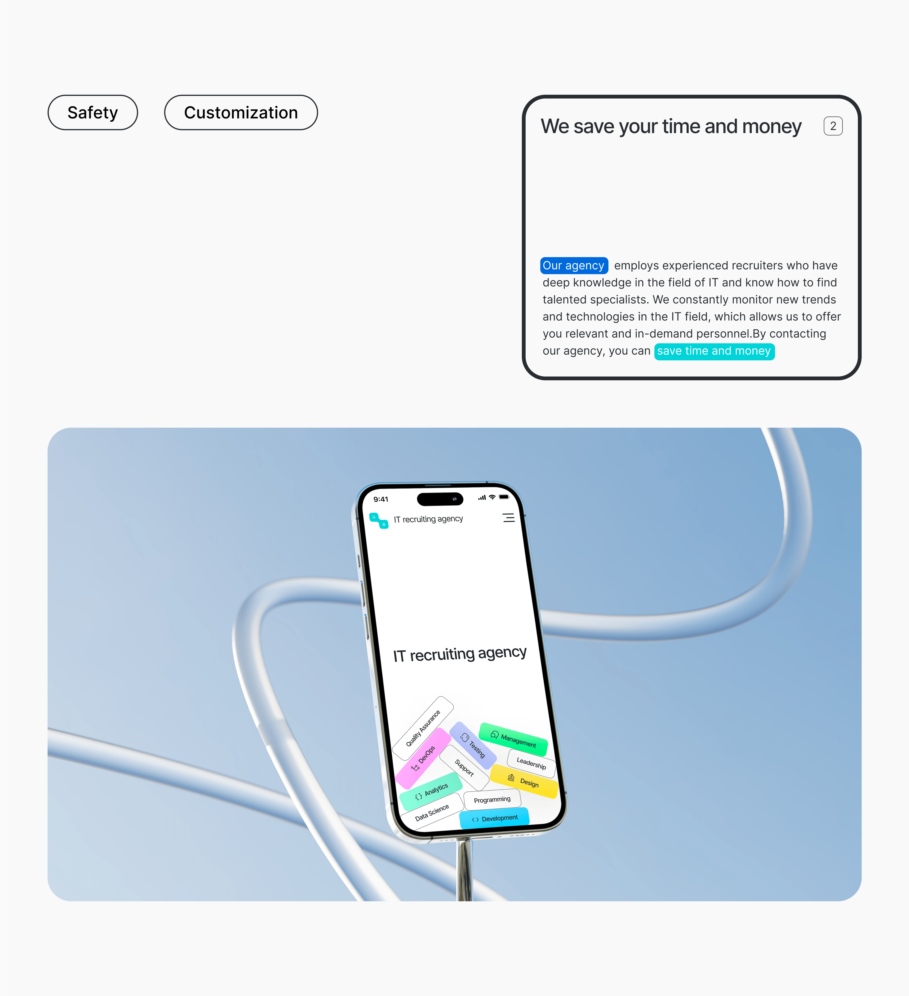Кастомный слайдер карточек с таймером в виде «загрузочной полосы». Кажется мелочью, но она отсылает к привычному для IT-индустрии паттерну UX: карточки меняются сами, как будто система сканирует подходящих кандидатов.