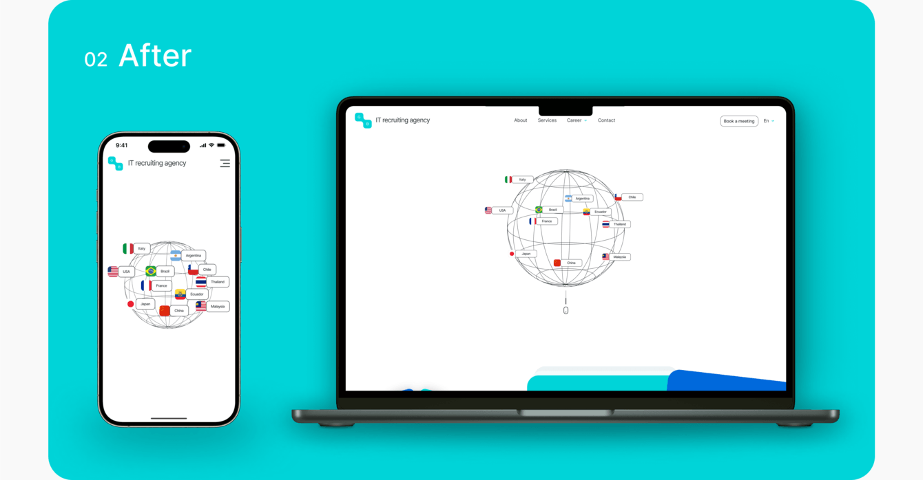 3D-модель планеты на главной сразу объясняет: работаем по всему миру. И это не шаблонная карта, а вращающаяся интерактивная модель — символ глобальности.