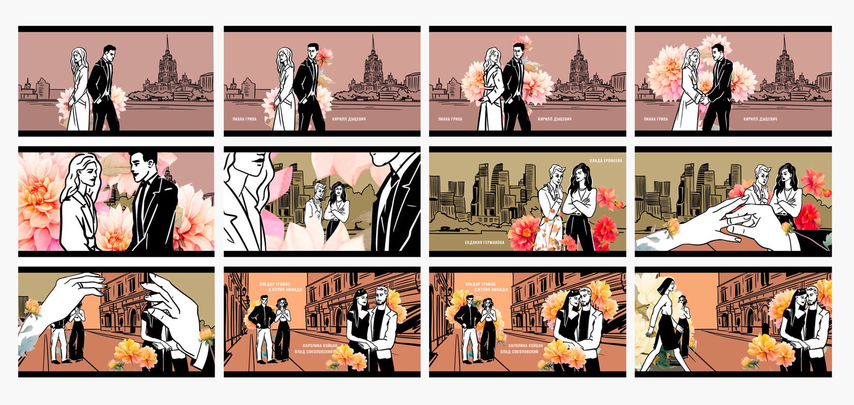 После того, как все статичные материалы были согласованы, мы приступили к анимации. Сначала наметили переходы кадров и общие движения, затем более точечно доработали анимацию каждого цветочка и его тени в кадре, и движения героев.