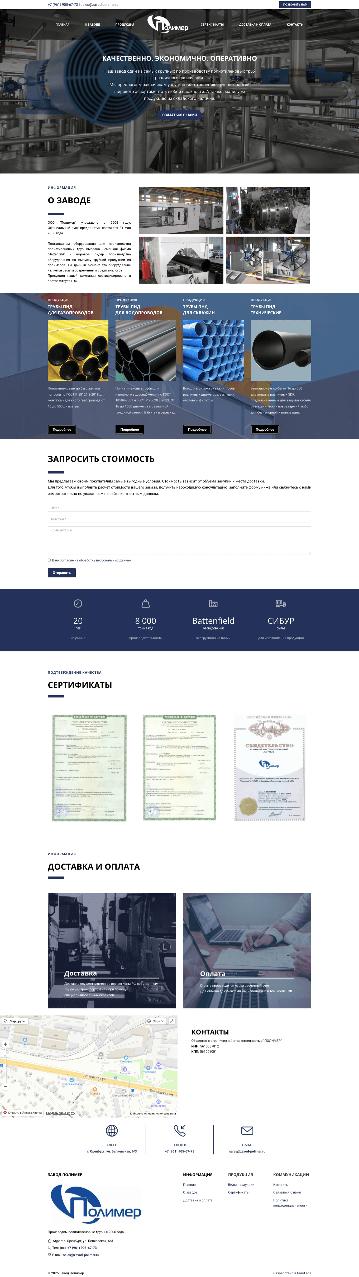 Завод по производству полиэтиленовых труб различных диаметров и назначения обратился с запросом на создание современного и функционального сайта. Основная цель — быстро запустить лендинг, который станет опорной точкой для рекламной кампании в Яндекс Директ и позволит эффективно конвертировать трафик в обращения. Сайт должен информировать потенциальных клиентов о продукции, условиях поставки по России и выгодно представлять компанию на фоне конкурентов.