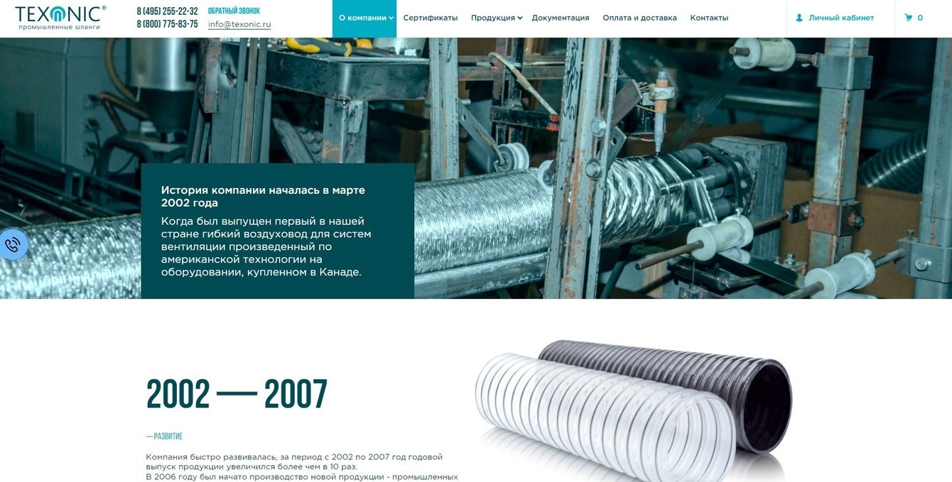 Для повышения клиентской лояльности был детально проработан раздел «О компании» – он наполнен фактами о развитии компании, фотографиями производства и новостями.