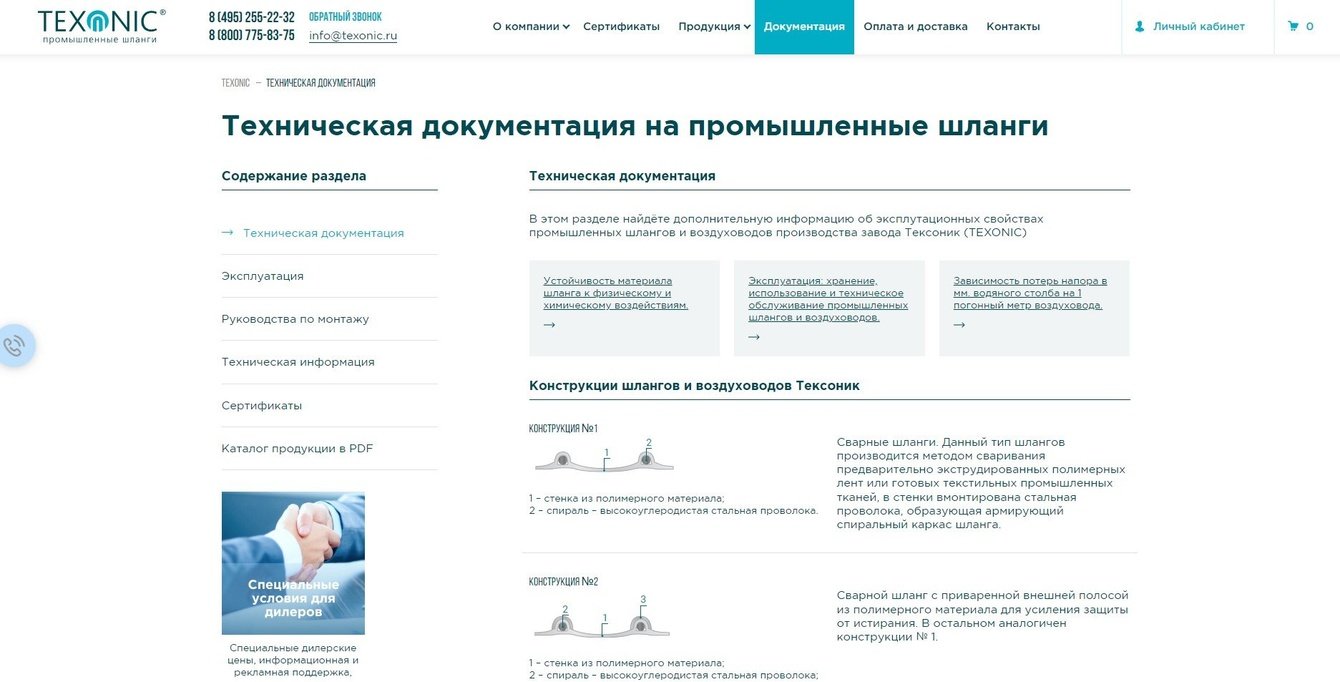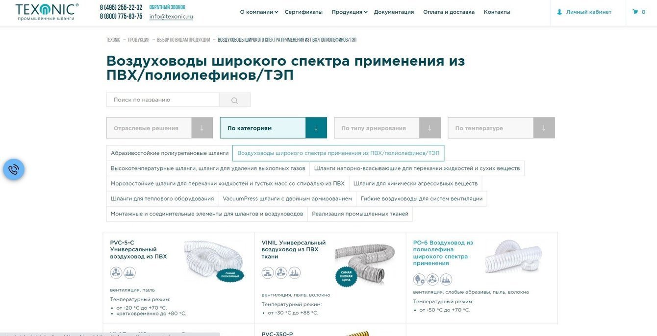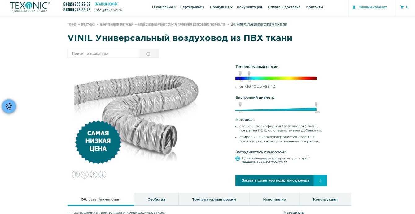 Важно было сделать карточку товара максимально информативной. Поэтому для наглядности, помимо фото и технических характеристик, были добавлены шкала температур и шкала диаметра, а также были прорисованы иконки различных отраслей и сфер применения воздуховодов и шлангов, конструкционные схемы.