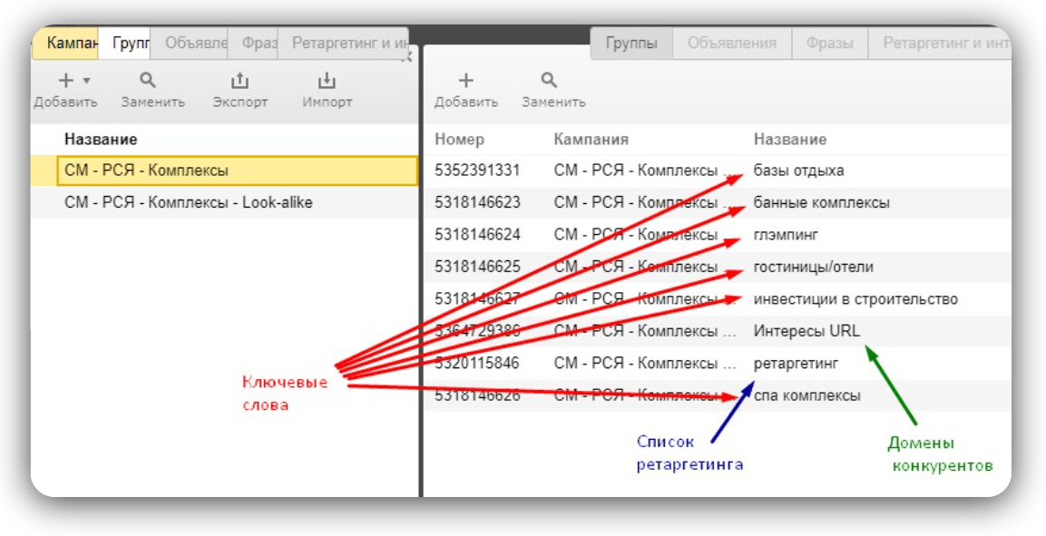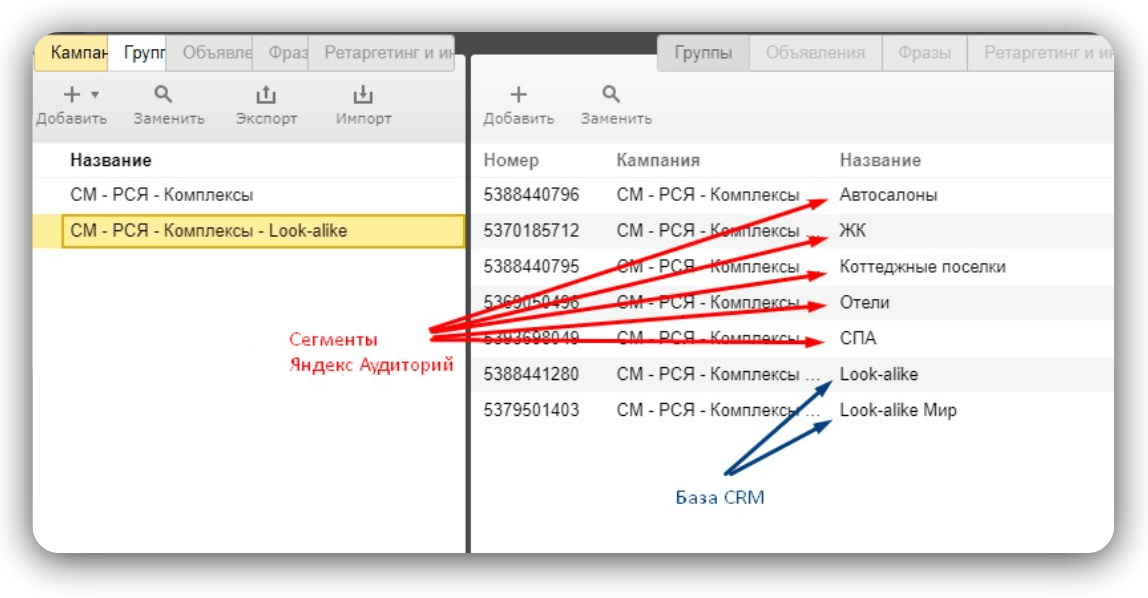 Сегментацию по группам в рамках обозначенных выше таргетингов можно увидеть на скриншоте: