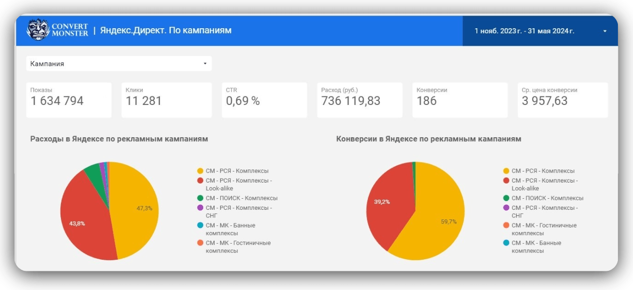 Перейдем к результатам. На скринах ниже можно увидеть общие данные за время проведения кампании по основным метрикам, а также распределение расходов и конверсий между кампаниями.