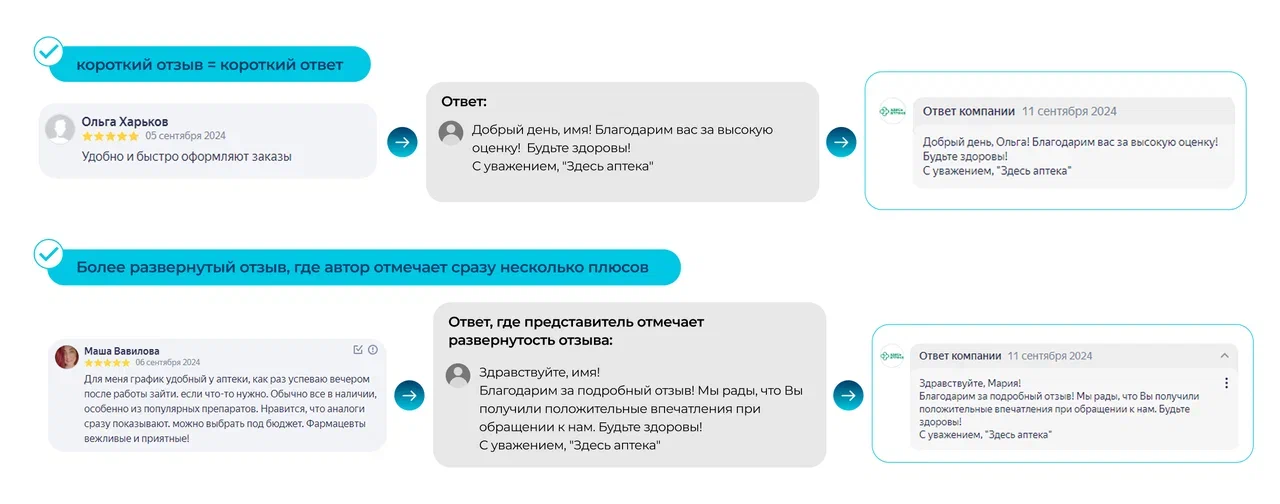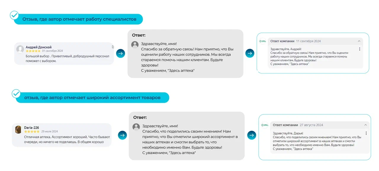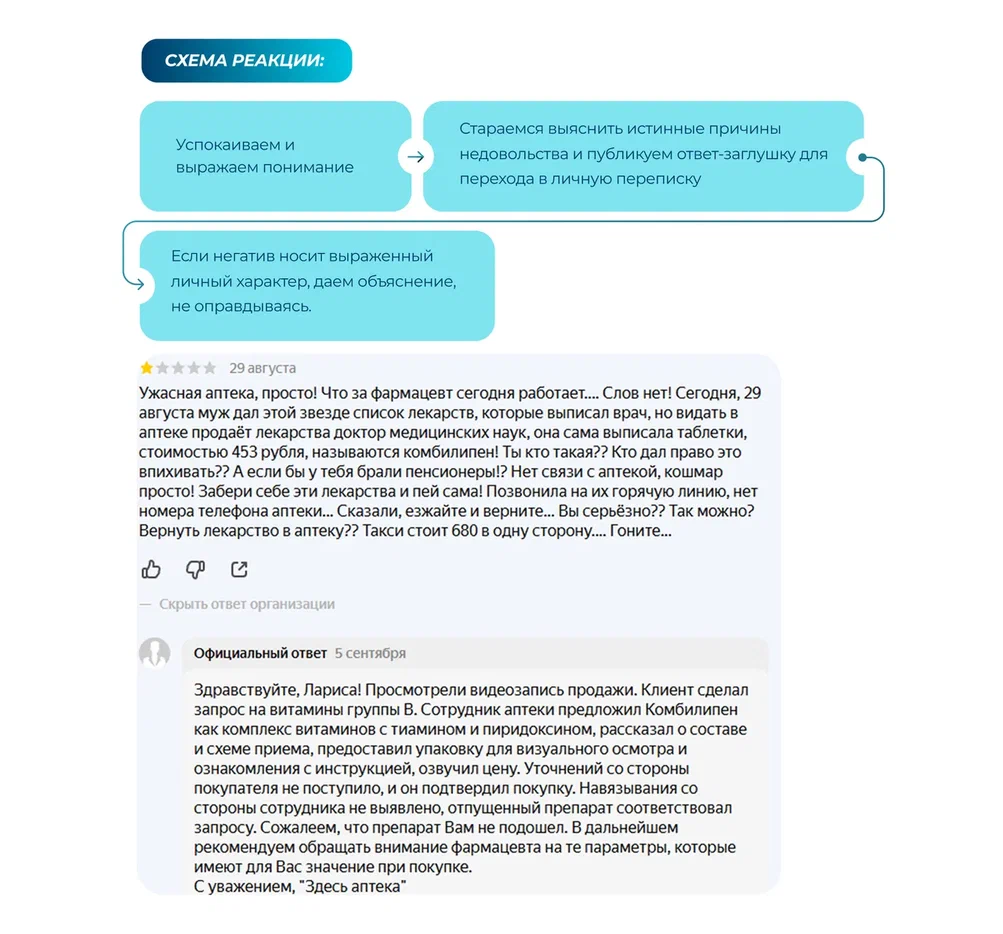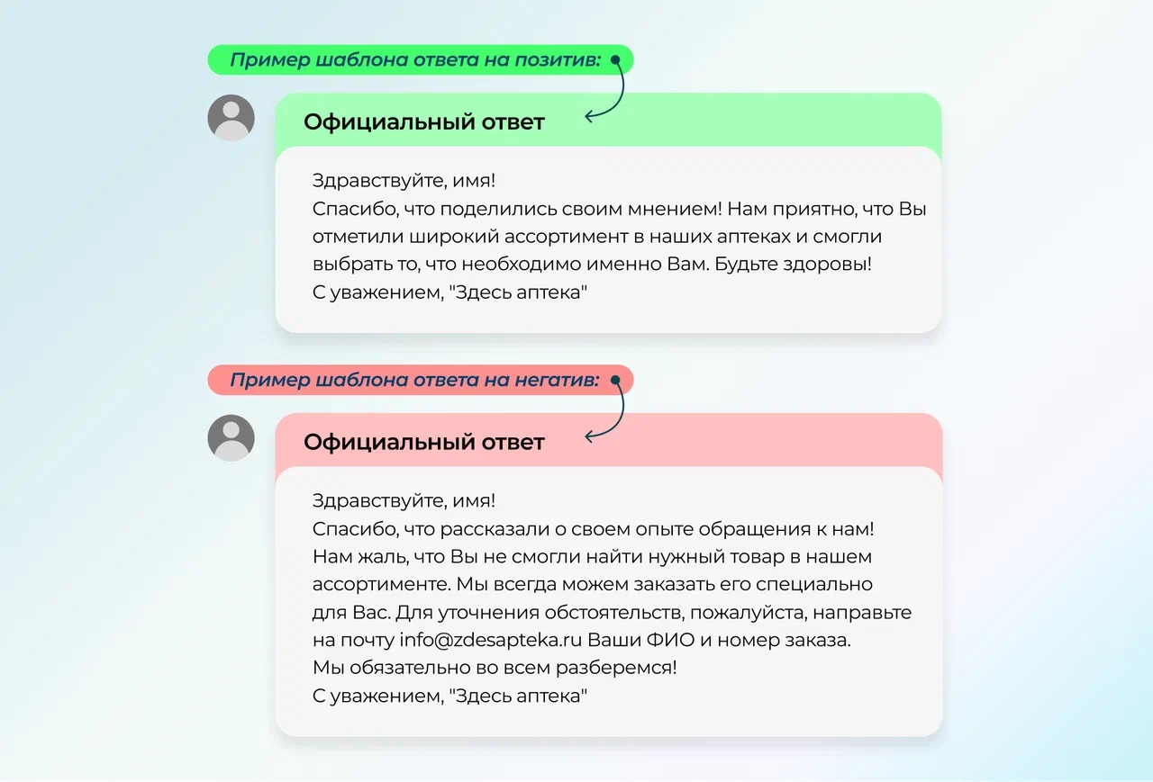 В ответе обращаемся к клиенту официально, уважительно и на «вы». Показываем заботу и внимательность к посетителям аптеки. Отвечая на негатив, мы не оправдываемся, а поясняем официальную позицию.